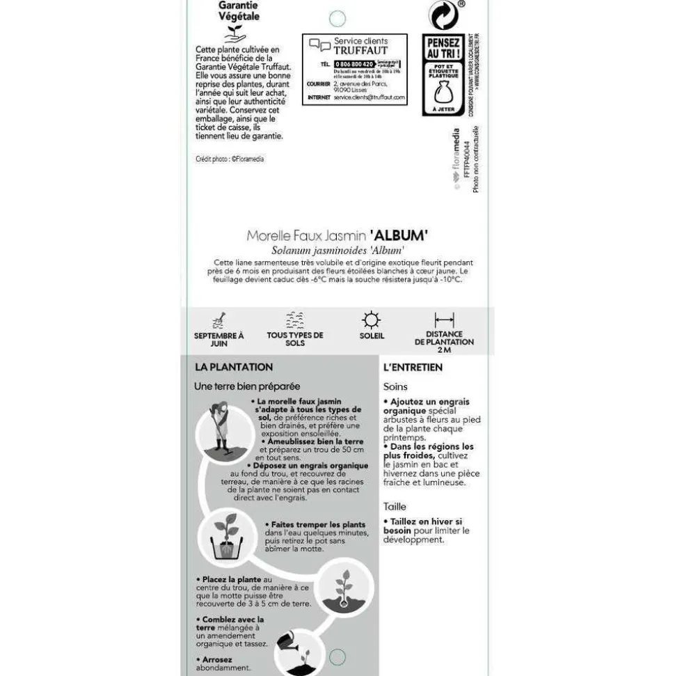 Le genre Solanum comprend environ 1400 espèces, d’origine cosmopolite. Solanum jasminoïdes est l’une de ces espèces, originaire d’Amérique du Sud. ‘Album’ est une variété horticole.Cette variété de Solanum atteint 5 m de hauteur pour une largeur de 2,50 m. Feuillage semi-persistant, vert brillant. Floraison de juin à octobre. Fleurs blanc pur, en étoiles, réunies en grappes.Pousse dans un sol normal, même calcaire. Exposition au soleil. Rustique jusqu’à -15°C (température à laquelle la souche est détruite). Si les parties aériennes gèlent, la plante repartira du piedUtilisation : pour garnir murs, clotures, piliers.