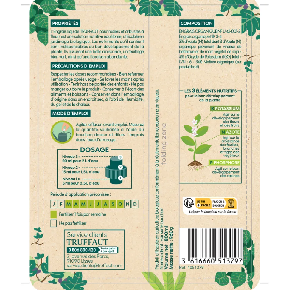 L鈥橢ngrais liquide TRUFFAUT pour rosiers et arbustes à fleurs est une solution nutritive équilibrée, utilisable en jardinage biologique. Les nutriments qu’il contient sont indispensables au bon développement de la plante. Ils assurent une belle croissance, un feuillage bien vert, ainsi qu’une floraison abondante. Disponible en flacon de 800ml pour 80L d’eau d’arrosage. Engrais liquide Truffaut rosiers et arbustes à fleurs 800 ml.