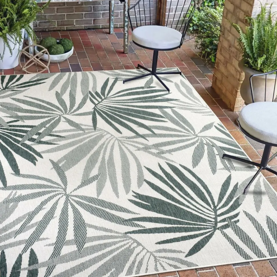Tapis Kilim. Matiére : Polypropylène. Poids : 5.83 Gr. Fabrication : tissé. Forme : tapis Rectangulaire. Largeur : 160 cm. Longueur : 230 cm. Hauteur : 8 mm. Dimension idéal pour : terrasse, jardin. Couleur : écru, vert. Motif : Nature Floral. Pays d’origine : Belgique. Entretien aspirateur ou chiffon humide.
