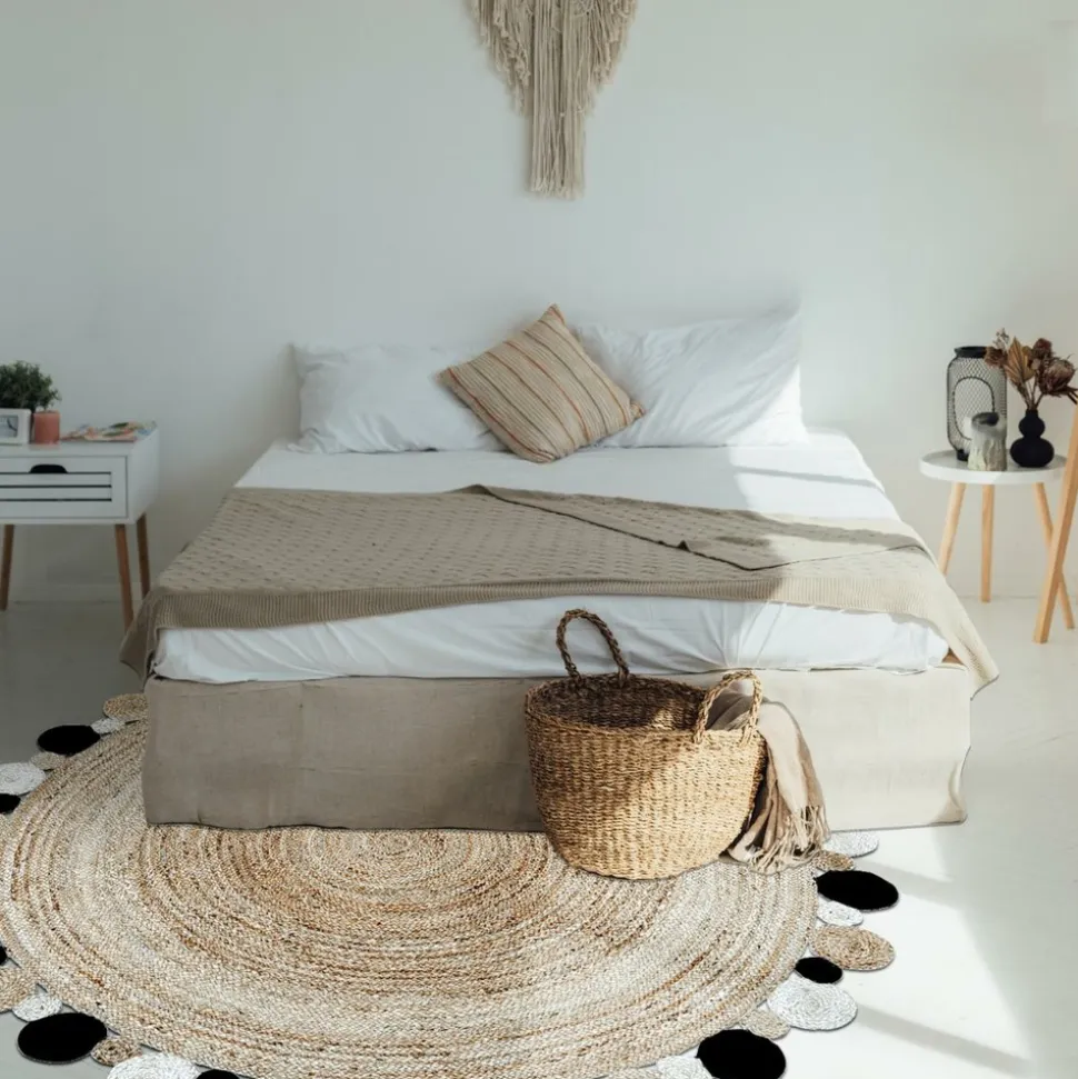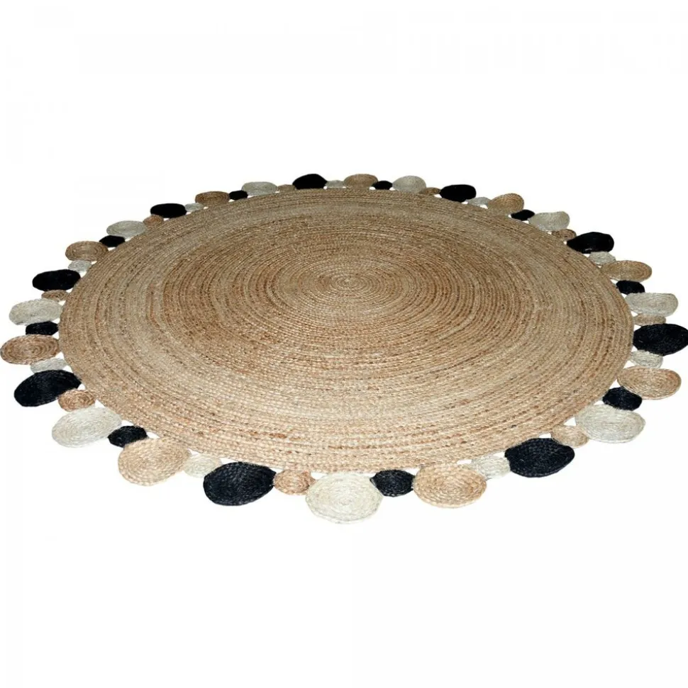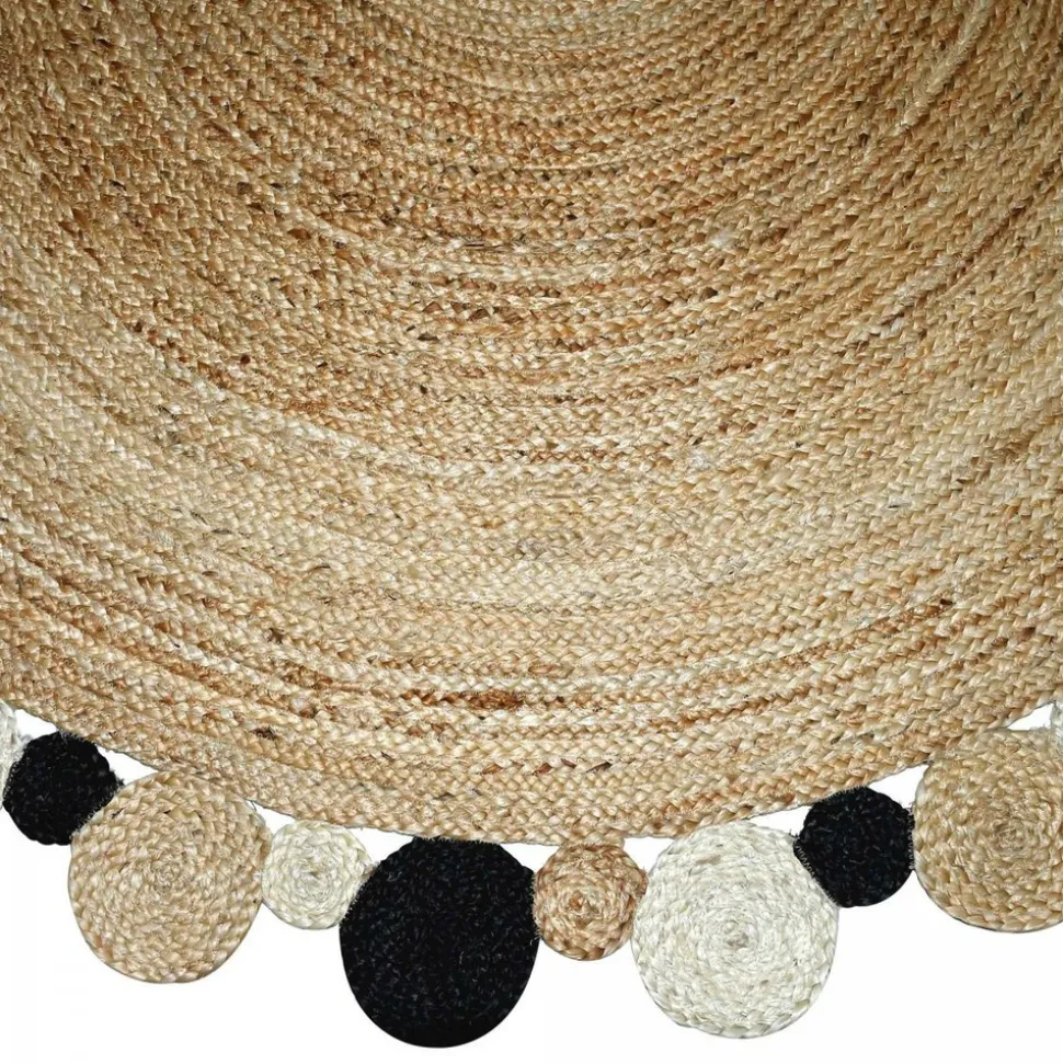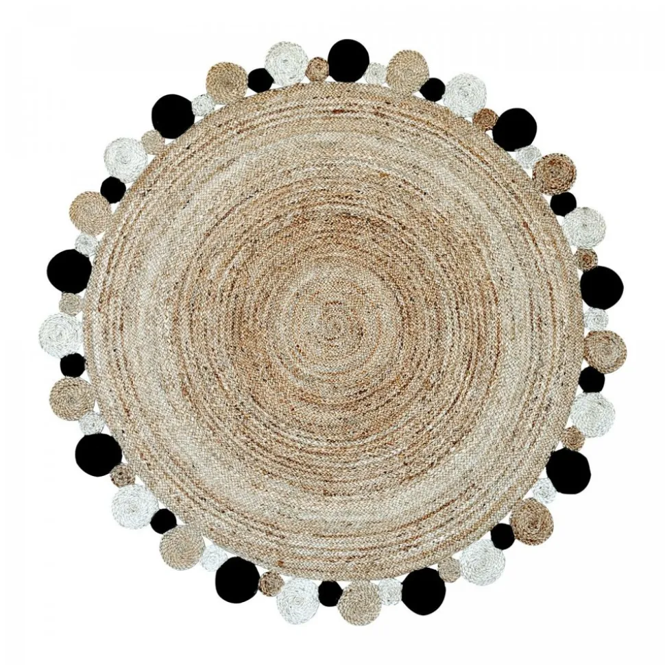 Tapis Kilim. Matiére : Jute. Poids : 4.9 Gr. Fabrication : tissé à la main. Forme : tapis Rond. Largeur : 150 cm. Longueur : 150 cm. Hauteur : 6 mm. Dimension idéal pour : Salon. Couleur : Beige, noir, écru. Motif : Motif rond. Pays d’origine : Inde. Entretien aspirateur ou chiffon humide.