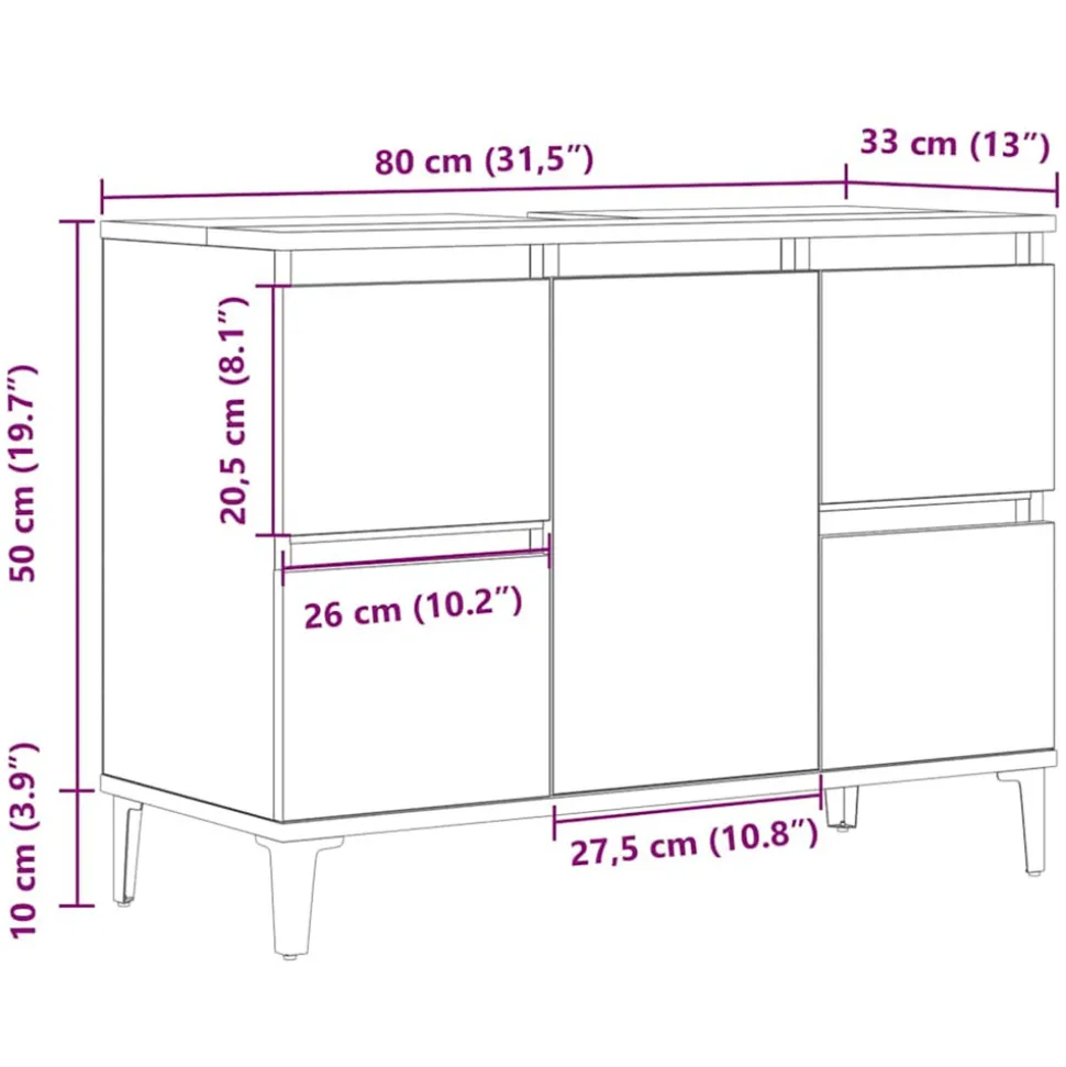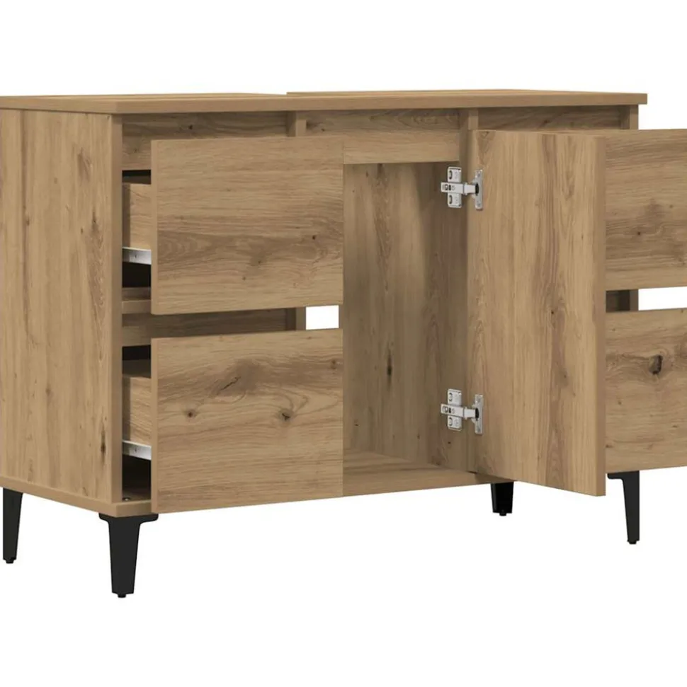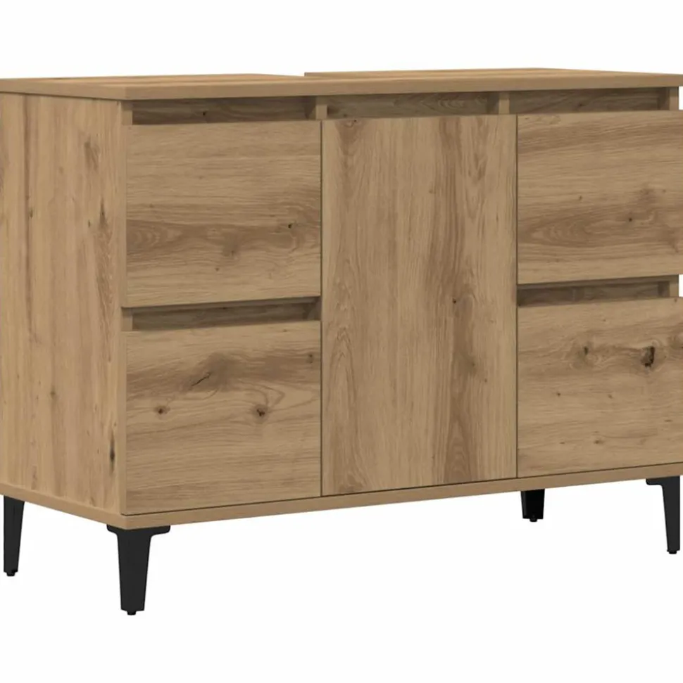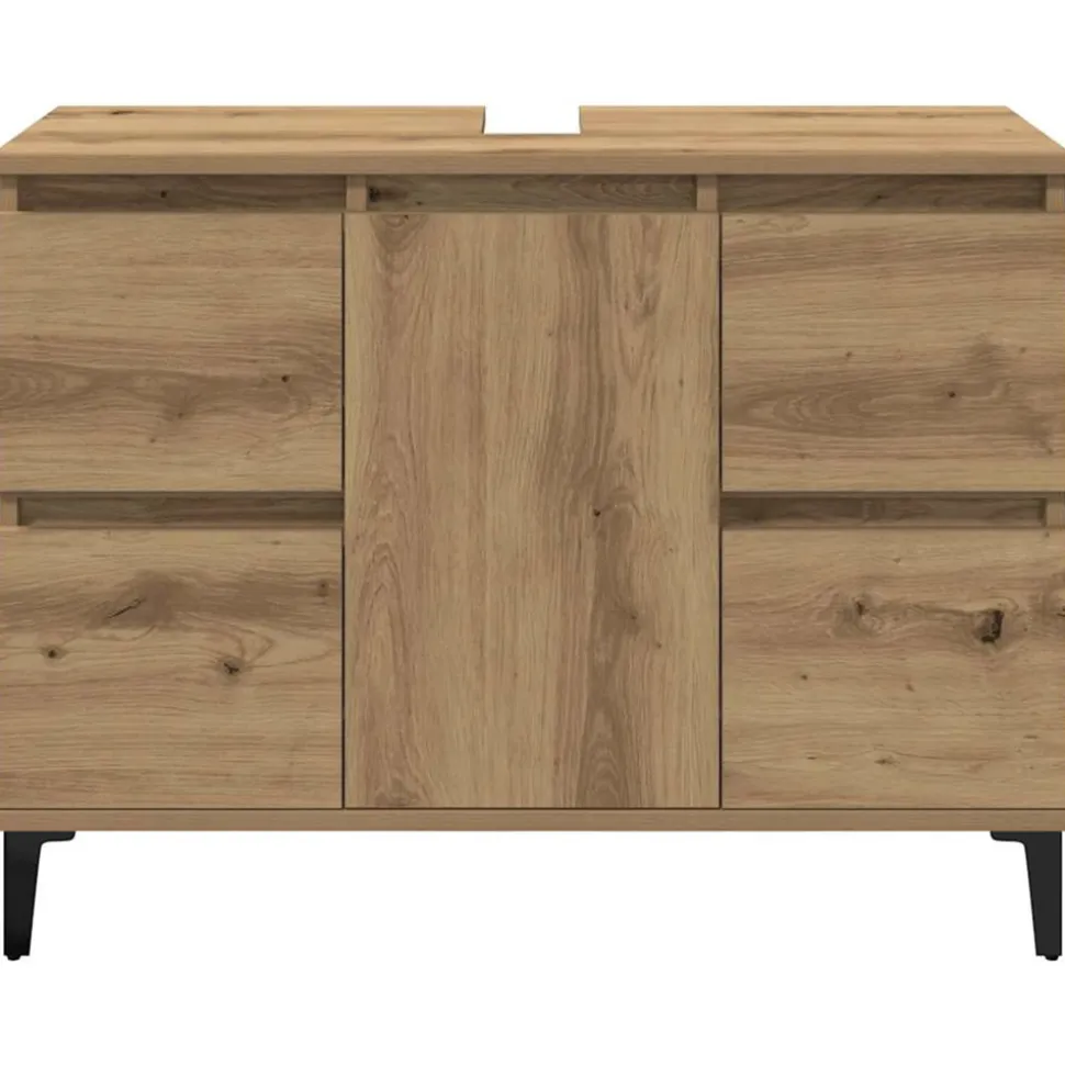Cette armoire de lavabo est censée être un excellent supplément à votre salle de bain, ce qui lui donne une apparence ordonnée et saisissante ! Matériau durable : le bois d’ingénierie est d’une qualité exceptionnelle avec une surface lisse et présente également résistance, stabilité et résistance à l’humidité.Grand espace de rangement : le meuble d’évier de salle de bain dispose de 4 tiroirs et d’1 compartiment avec une porte, offrant diverses options de rangement et un espace supplémentaire pour ranger des articles dans votre salle de bain. Le dessus du meuble de salle de bain est idéal pour placer l’évier.Pieds en métal : les pieds en métal ajoutent un style moderne et calme à votre intérieur tout en assurant la stabilité.Surface facile à nettoyer : le meuble de salle de bain est facile à nettoyer avec un chiffon humide. Attention :Pour éviter qu’il ne soit renversé, ce produit doit être utilisé avec le dispositif de fixation au mur fourni. Bon à savoir :Pour faciliter au maximum le montage, chaque produit est livré avec des instructions.L’évier n’est pas inclus.