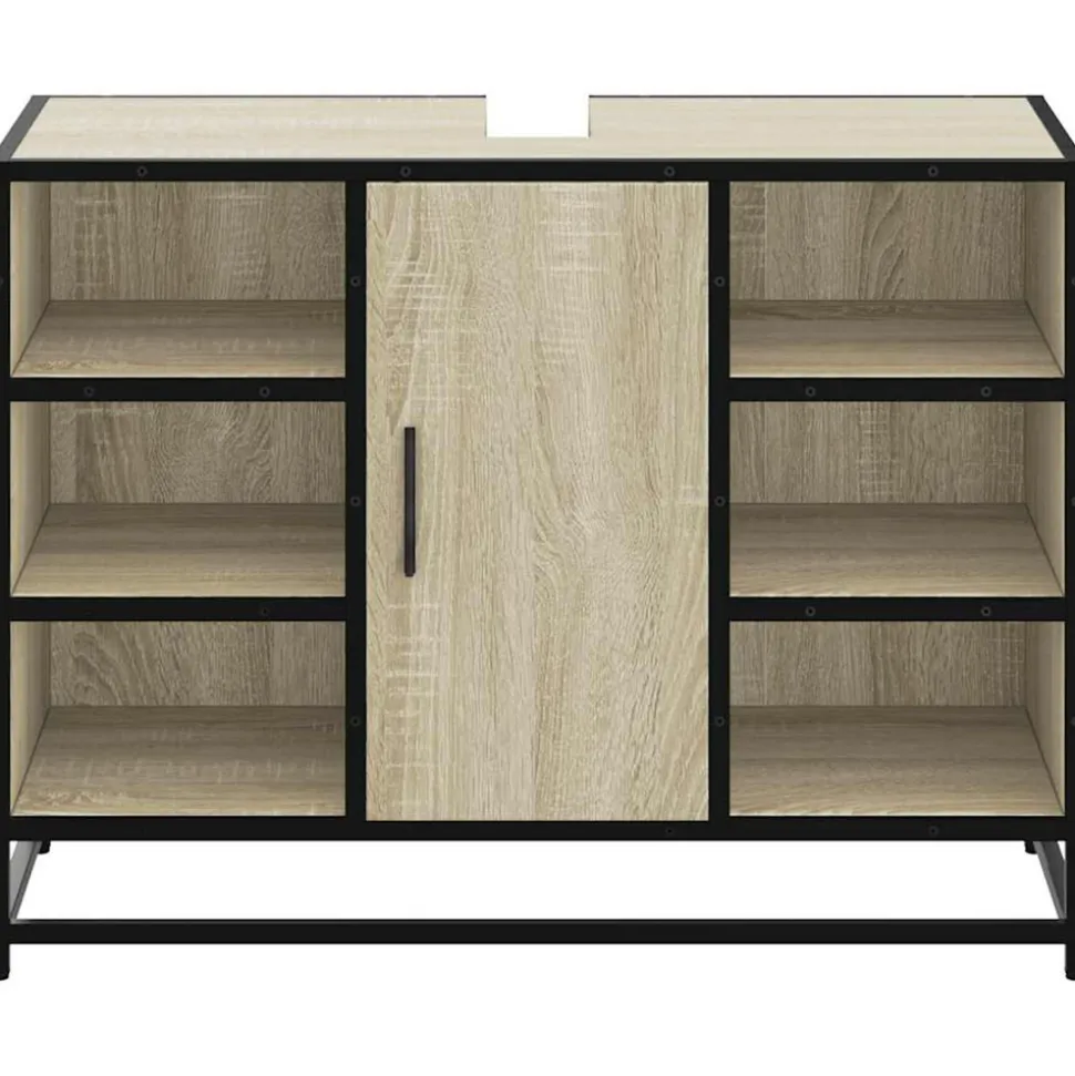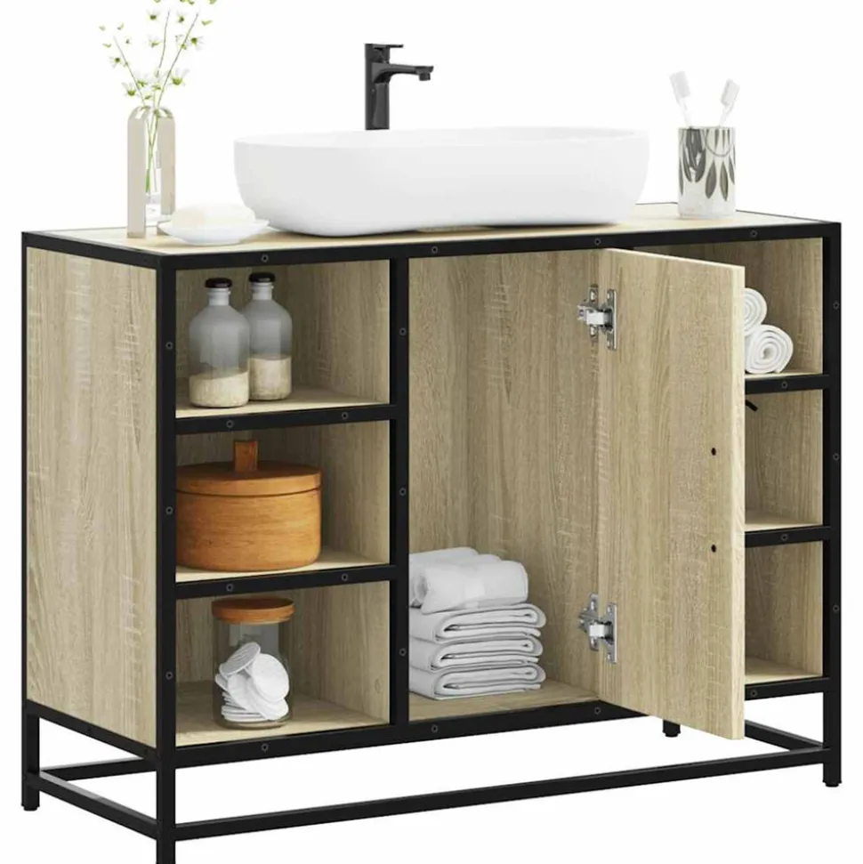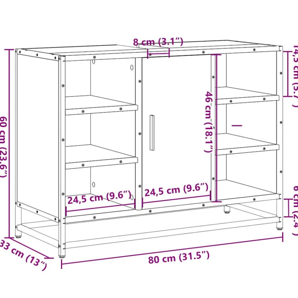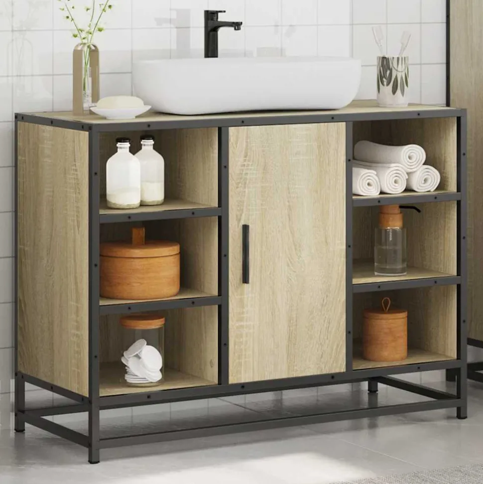 Ce meuble de lavabo de salle de bain est destiné à être un excellent supplément à votre salle de bain, lui donnant une apparence rétro et élégante ! Matériau stable et durable : le bois d’ingénierie est un matériau durable et stable dont la surface lisse résiste à l’humidité, à la déformation et au fendillement, ce qui en fait un choix fiable pour une grande variété de projets.Cadre stable et durable : le cadre en métal du meuble de salle de bain rehausse votre intérieur d’un style industriel et offre une durabilité, une stabilité et une résistance à la corrosion exceptionnelles.Grand espace de rangement : ce meuble de salle de bain offre suffisamment d’espace de rangement pour garder vos essentiels bien organisés et à portée de main.Dessus de meuble pratique : le dessus du meuble d’évier a un trou, il est donc idéal pour placer l’évier.Aspect attrayant : le design remarquable de l’armoire de salle de bains rehausse l’aspect général de votre espace grâce à ses lignes douces et à ses motifs sophistiqués, ce qui en fait le point fort de n’importe quelle pièce. Attention :Pour éviter qu’il ne bascule, ce produit doit être utilisé avec le dispositif de fixation murale fourni.