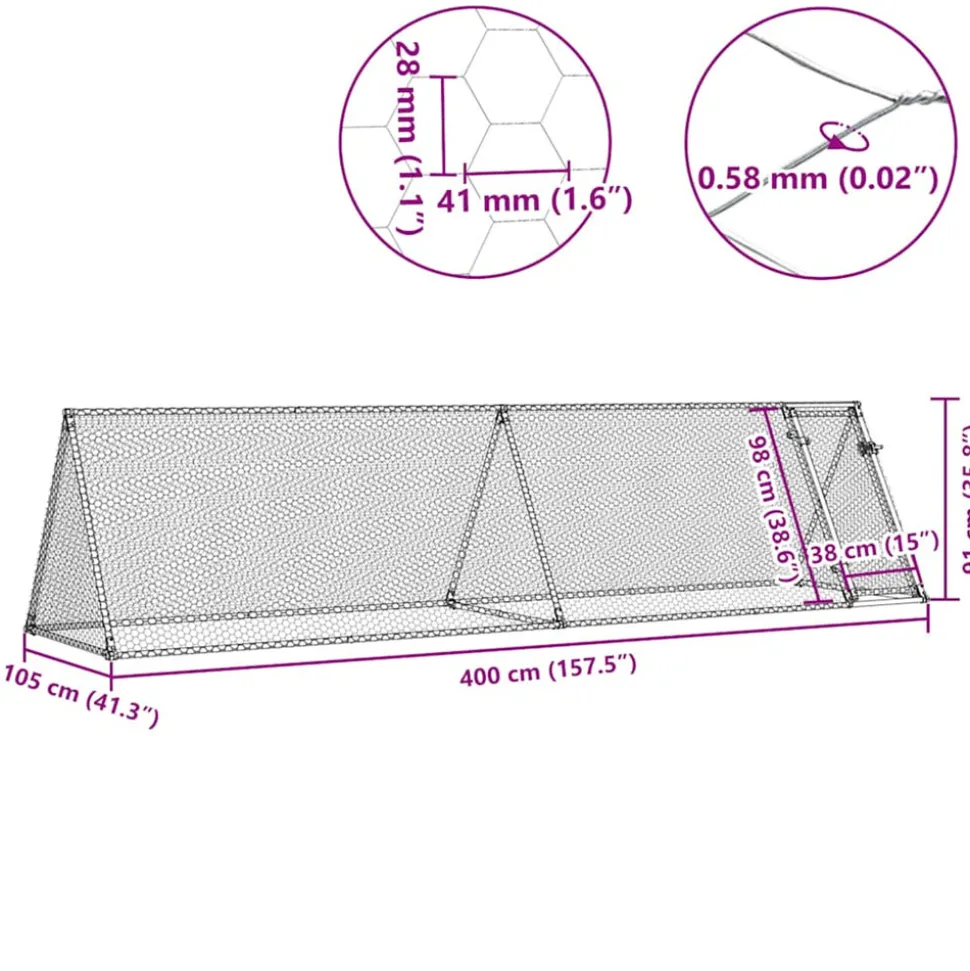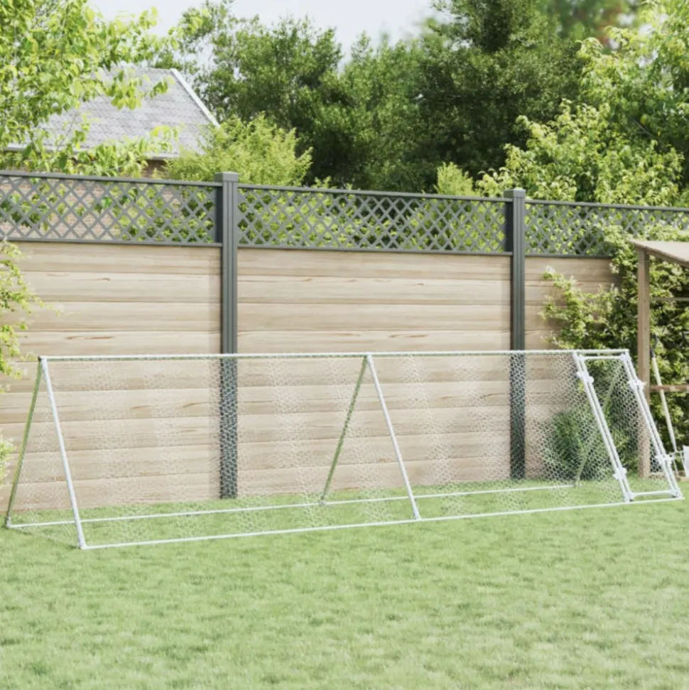 Ce poulailler pratique et spacieux est un choix parfait comme enclos d’extérieur pour le confort de vos poules, canards et autres petits animaux et les maintient à l’aise. Cadre durable et robuste : le poulailler est fabriqué en acier galvanisé. l’acier est un matériau exceptionnellement dur et solide. Il offre robustesse et stabilité. La galvanisation offre une meilleure protection contre la corrosion et est utile pour les produits qui seront utilisés à l’extérieur et dans des environnements difficiles.Grande espace d’activité : la cage à poulets offre à vos poules un vaste espace d’activité pour se promener facilement. En outre, elle convient également à d’autres petits animaux tels que les oiseaux, les lapins, les canards, les oies, etc.Sécurité supplémentaire : la porte à charnière avec un système de verrouillage verrouillable du poulailler d’entrée assure une sécurité supplémentaire à vos poules. Couleur : argentéMatériau : acier galvaniséDimensions : 400 x 105 x 91 cm (l x P x H)Comprend une porte avec serrureAssemblage requis : ouiCouleur : argentéMatériau : acier galvaniséDimensions : 400 x 105 x 91 cm (l x P x H)Comprend une porte avec serrureAssemblage requis : oui