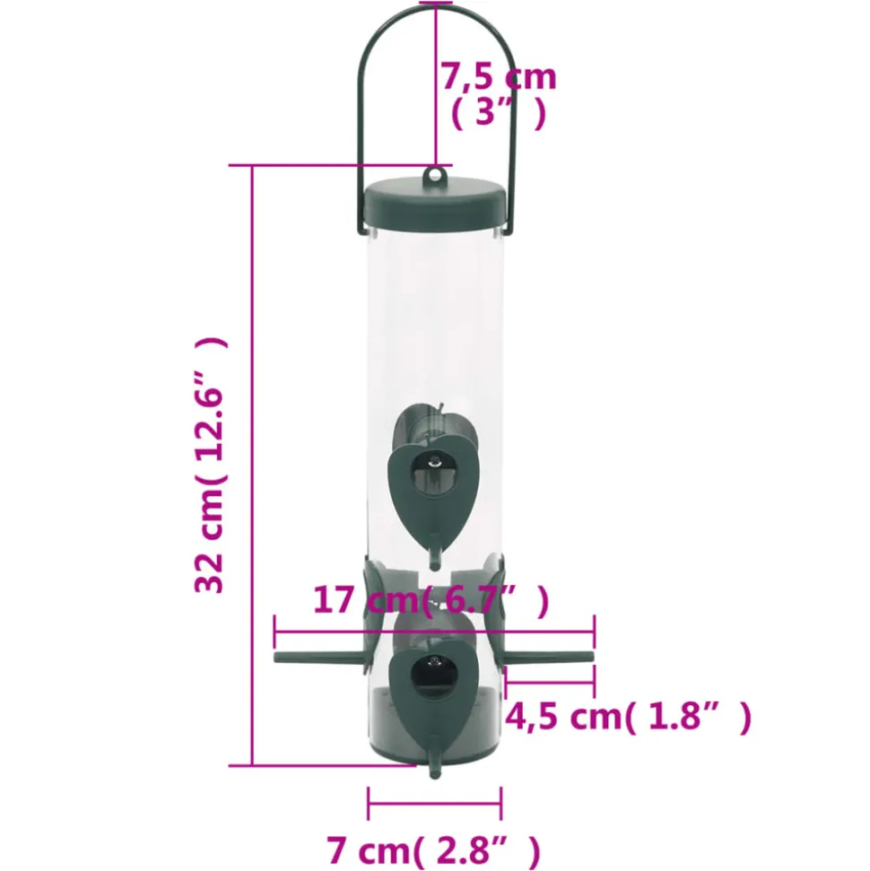 Avec un look élégant et un design classique, ces mangeoires pour oiseaux peuvent attirer plus d’oiseaux et ajouter plus de dynamisme à votre jardin. Matériaux durables : fabriquée en matière plastique, cette station d’alimentation pour oiseaux est légère, robuste et résistante aux chocs. 6 ports d’alimentation : cette mangeoire suspendue pour oiseaux est conçue avec 6 ouvertures d’alimentation qui permettent à plus d’oiseaux de se nourrir en même temps pour créer un spectacle ravissant. Facile à accrocher : la mangeoire pour oiseaux a une poignée de transport, ce qui la rend facile à accrocher sur les supports de mangeoire pour oiseaux, les crochets, les poteaux, les branches d’arbres, etc. Facile à remplir : cette mangeoire pour oiseaux de jardin est dotée d’un couvercle pivotant pour faciliter le remplissage. Le compartiment à graines transparent vous permet de voir quand il est temps de le remplir. Couleur : vert foncé Matériau : PP (polypropylène), PS (polystyrène) Dimensions totales (sans poignée) : 17 x 17 x 32 cm (L x l x H)Capacité : 0,68 kgStations d’alimentation : 6La livraison contient :3 x mangeoire à oiseauxCouleur : vert foncé Matériau : PP (polypropylène), PS (polystyrène) Dimensions totales (sans poignée) : 17 x 17 x 32 cm (L x l x H)Capacité : 0,68 kgStations d’alimentation : 6La livraison contient :3 x mangeoire à oiseaux