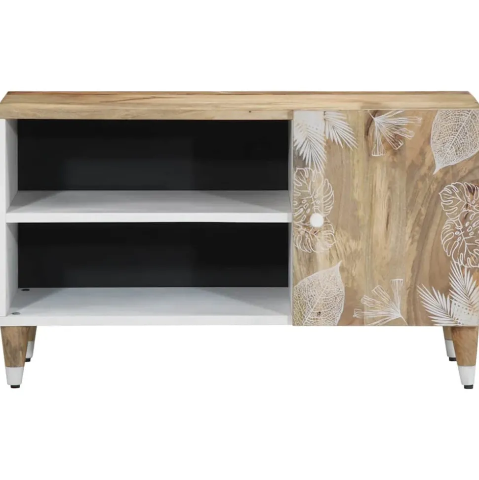 Ce meuble TV avec un grand espace de rangement est un complément pratique et attrayant pour votre salon ou votre chambre à coucher. Matériau robuste et stable : le bois de manguier massif, un bois dur tropical robuste, est très apprécié pour la fabrication de meubles en raison de sa durabilité et de sa solidité exceptionnelles. Ses beaux grains de bois rendent chaque meuble unique et légèrement différent de l’autre.Grand espace de rangement : ce meuble TV offre un grand espace de rangement pour garder vos magazines, livres, DVD et appareils multimédias bien organisés et à portée de main.Dessus stable et robuste : le dessus robuste est idéal pour placer votre téléviseur et vos systèmes stéréo ou certains objets décoratifs tels que des vases ou des plantes en pot.Avec pieds : les pieds surélevés facilitent le nettoyage sous le meuble TV, préservant ainsi une apparence soignée et assurant une meilleure circulation de l’air autour des équipements électroniques. Bon à savoir :Chaque article est unique, avec des variations de couleurs et de grains. La livraison est aléatoire, ce qui garantit l’exclusivité et l’individualité de votre produit.