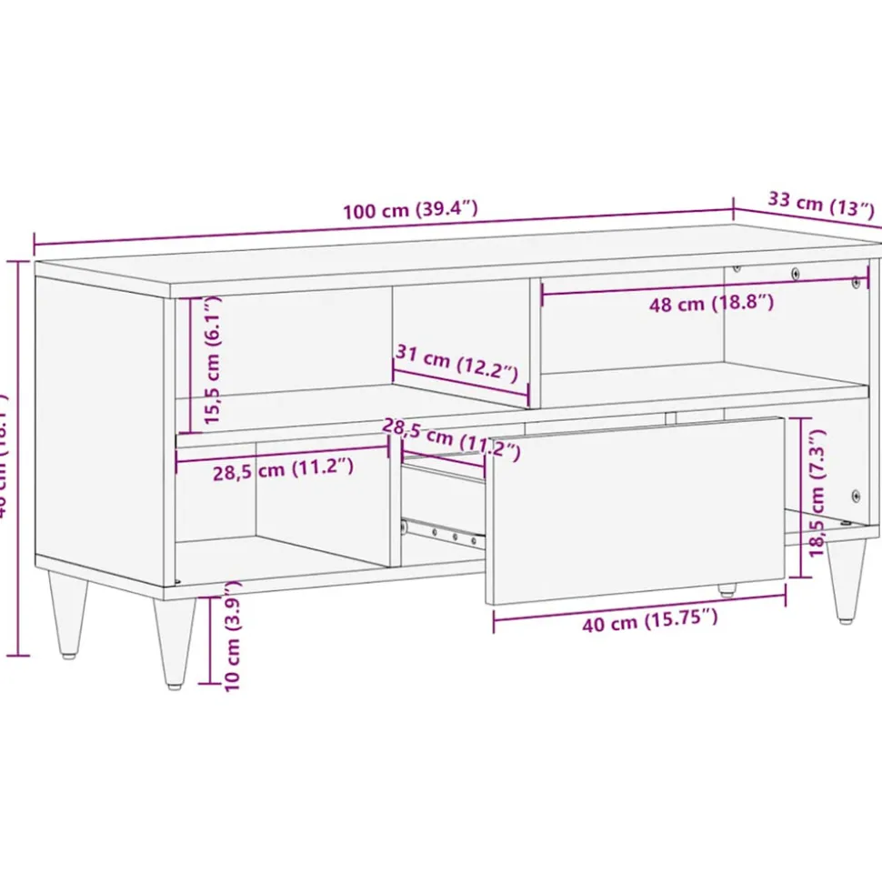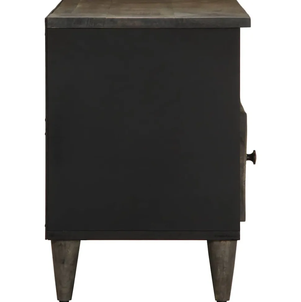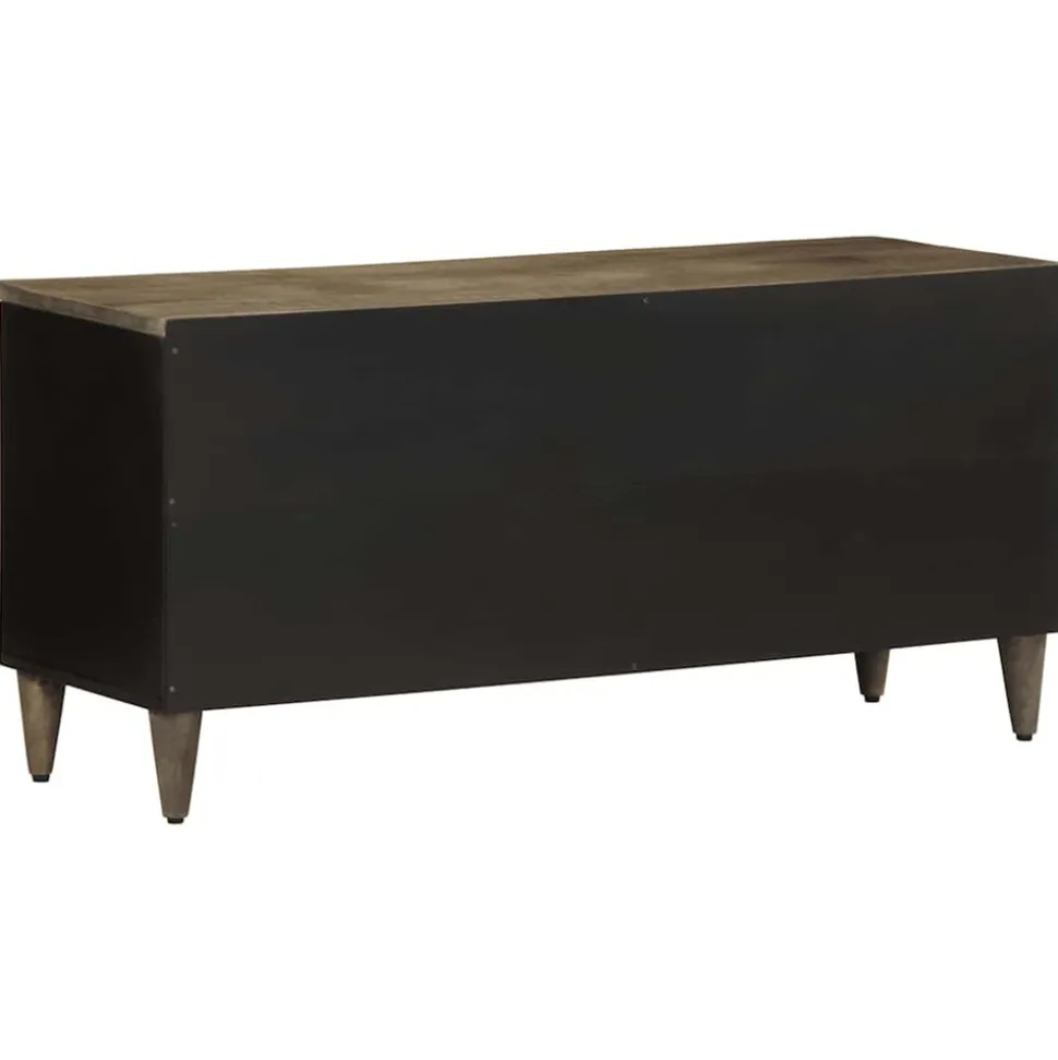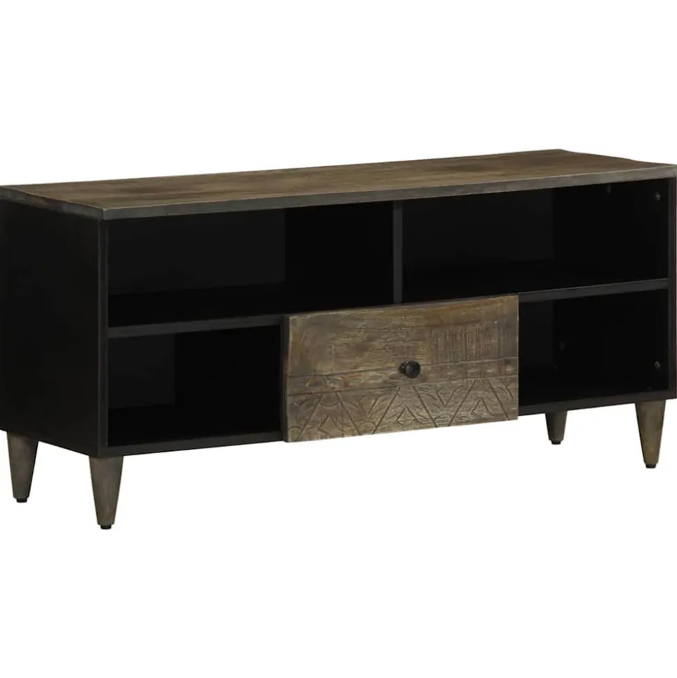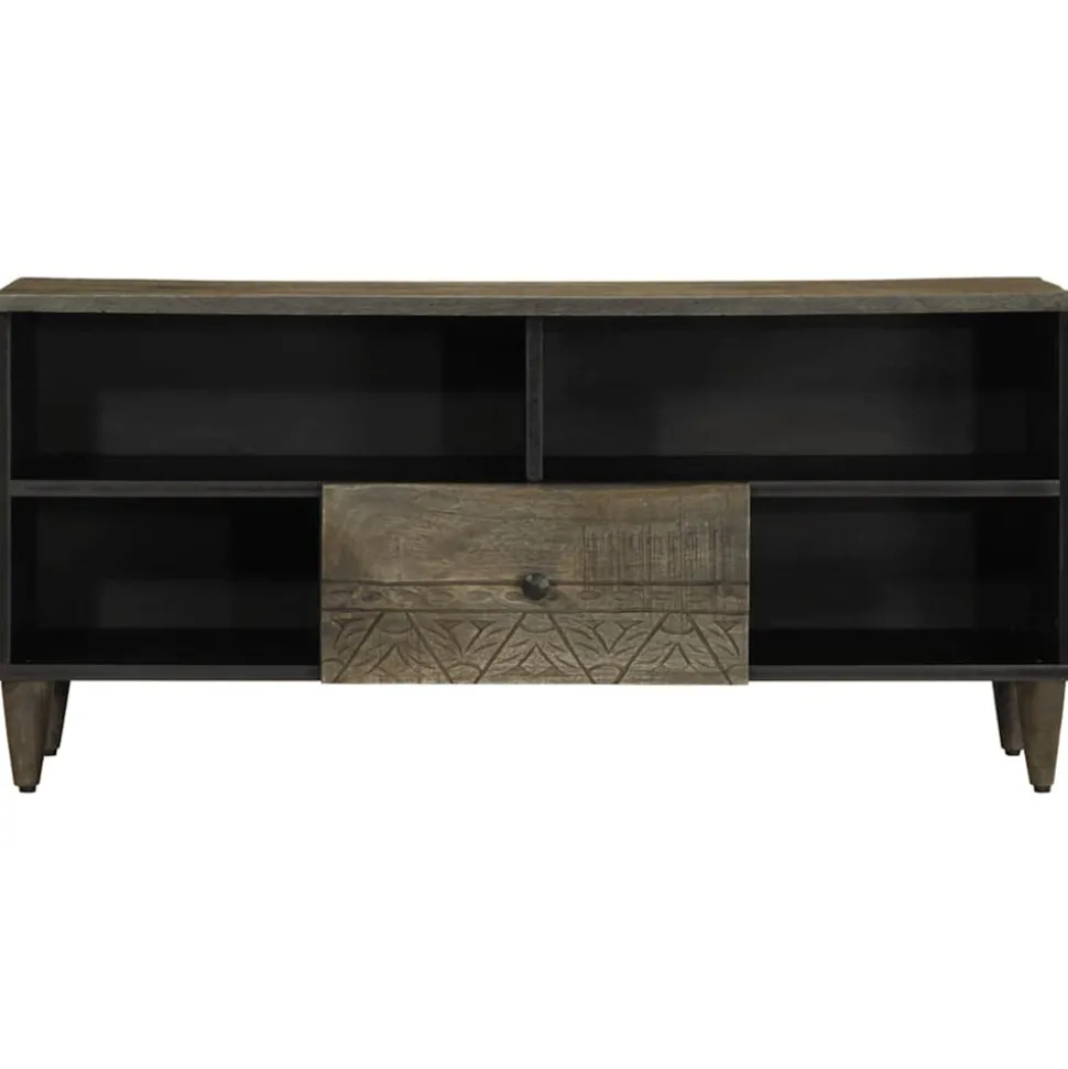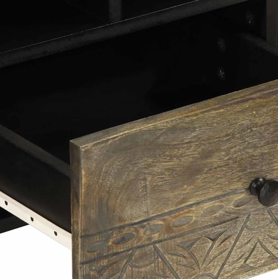 Ce meuble TV en bois avec un grand espace de rangement est un complément pratique et attrayant pour votre salon ou votre chambre à coucher. Matériau robuste et stable : le bois de manguier massif, un bois dur tropical robuste, est très apprécié pour la fabrication de meubles en raison de sa durabilité et de sa solidité exceptionnelles. Ses beaux grains de bois rendent chaque meuble unique et légèrement différent de l’autre.Grand espace de rangement : ce meuble TV offre un grand espace de rangement pour garder vos magazines, livres, DVD et appareils multimédias bien organisés et à portée de main.Motif sculpté à la main : le motif délicatement sculpté donne au meuble TV un aspect unique.Dessus stable et robuste : le dessus robuste est idéal pour placer votre téléviseur et vos systèmes stéréo ou certains objets décoratifs tels que des vases ou des plantes en pot.Facile à entretenir : la console TV est facile à nettoyer à l’aide d’un chiffon humide et nécessite peu d’entretien. Bon à savoir :Chaque article est unique, avec des variations de couleurs et de grains. La livraison est aléatoire, ce qui garantit l’exclusivité et l’individualité de votre produit.