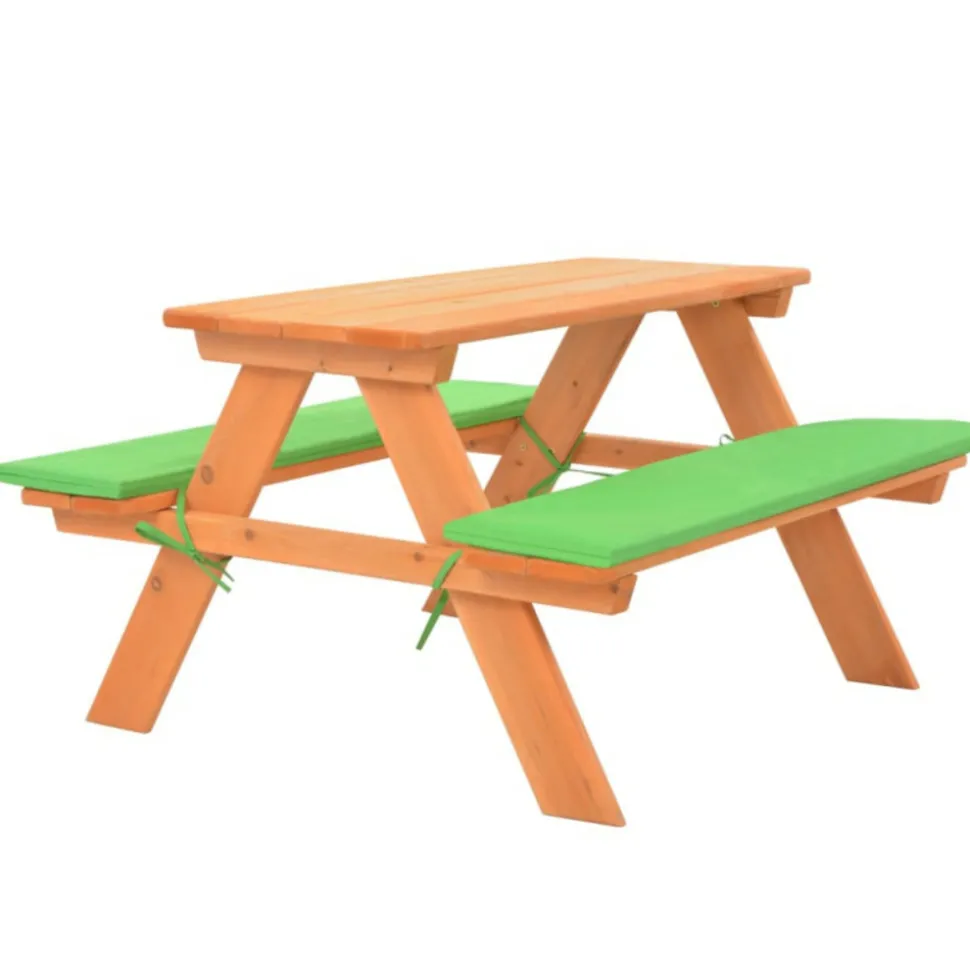 Assis autour de cette table de pique-nique avec bancs intégrés, vos enfants passeront un bon moment entre amis dans le jardin. La table de pique-nique est fabriquée en bois de sapin massif résistant aux intempéries, ce qui lui confère une structure stable et robuste. Les coussins fournis sont en polyester résistant à l’eau et épaississement rembourrés pour un confort d’assise optimal. Cette table de pique-nique pour enfants est facile à monter. Veuillez noter que le bois est un produit naturel et peut montrer des imperfections. Couleur du coussin : vertMatériau de la table : bois massif de sapinMatériau de la housse de coussin : Polyester 150 g / m²Dimensions totales : 89 x 79 x 50 cm (L x l x H)Dimensions du dessus de table : 89 x 34 cm (L x l)Dimensions du siège : 89 x 17 cm (L x l)Hauteur du siège à partir du sol : 28 cmAvec 2 bancs intégrésConvient aux enfants de 3 ans et plus Couleur du coussin : vertMatériau de la table : bois massif de sapinMatériau de la housse de coussin : Polyester 150 g / m²Dimensions totales : 89 x 79 x 50 cm (L x l x H)Dimensions du dessus de table : 89 x 34 cm (L x l)Dimensions du siège : 89 x 17 cm (L x l)Hauteur du siège à partir du sol : 28 cmAvec 2 bancs intégrésConvient aux enfants de 3 ans et plus