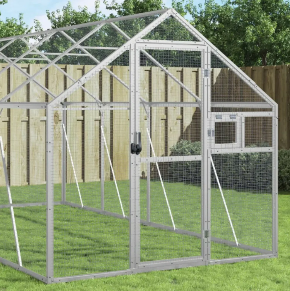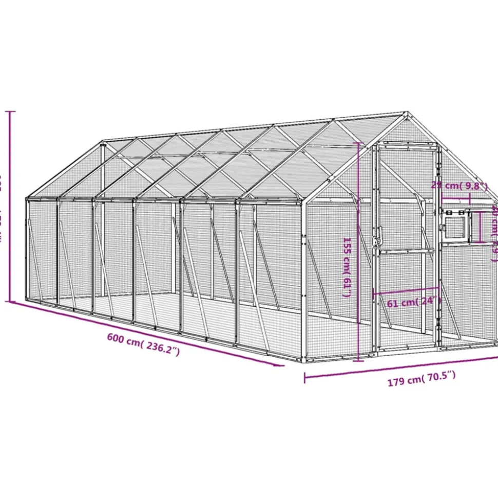 Cette volière offre un grand endroit confortable pour que vos oiseaux volent et jouent en toute sécurité. Cadre robuste : l’aluminium est un métal léger et solide. Il résiste à la corrosion grâce à une couche d’oxyde auto-protectrice. Grâce à la construction robuste en aluminium, cette volière est conçue pour durer.Grille métallique : la cage à perruches est équipée de grilles métalliques qui évitent les méfaits et les accidents inattendus. De plus, elles vous permettent d’observer vos oiseaux tous les jours et leur garantissent un large champ de vision et suffisamment d’air frais.Grande espace d’activité : la cage à perroquets offre à vos oiseaux un vaste espace d’activité pour se promener, jouer et voler facilement. En outre, elle convient également à d’autres petits animaux tels que les lapins, les canards, les poulets, les oies, etc.Porte et fenêtre verrouillables : la porte à charnière avec un système de verrouillage verrouillable de la grande cage à oiseaux assure une sécurité supplémentaires pour vos oiseaux. La grande cage à perroquets dispose également d’une fenêtre verrouillable pour faciliter l’alimentation. Couleur : argentéMatériau : aluminium, grille métallique soudée galvaniséeDimensions : 179 x 600 x 114/185 cm (l x P x H)Dimensions de la porte : 61 x 155 cm (L x l)Dimensions de la fenêtre verrouillable : 25 x 20 (L x l)Taille de la grille : 1 x 1 cm (L x l)L’assemblage est requis Attention, il faut porter des gants de protection. Le port de gants de protection est obligatoire. Veuillez porter des lunettes de sécurité, des gants, des chaussures de sécurité et un casque (protection de la tête) lorsque vous installez le produit. N’installez pas le produit dans des conditions météorologiques extrêmes telles que des vents forts ou des températures basses. Ne laissez pas les enfants et les animaux domestiques dans la zone d’assemblage. Le produit doit être construit sur une surface plane. Il est recommandé de fixer le produit à un objet inamovible ou au sol. Veillez à ce que le toit soit exempt de neige et de feuilles. De fortes quantités de neige sur le toit peuvent endommager le produit. Gardez les portes fermées et verrouillées pour éviter les dommages causés par le vent. Ne vous tenez pas sur le toit.Couleur : argentéMatériau : aluminium, grille métallique soudée galvaniséeDimensions : 179 x 600 x 114/185 cm (l x P x H)Dimensions de la porte : 61 x 155 cm (L x l)Dimensions de la fenêtre verrouillable : 25 x 20 (L x l)Taille de la grille : 1 x 1 cm (L x l)L’assemblage est requis