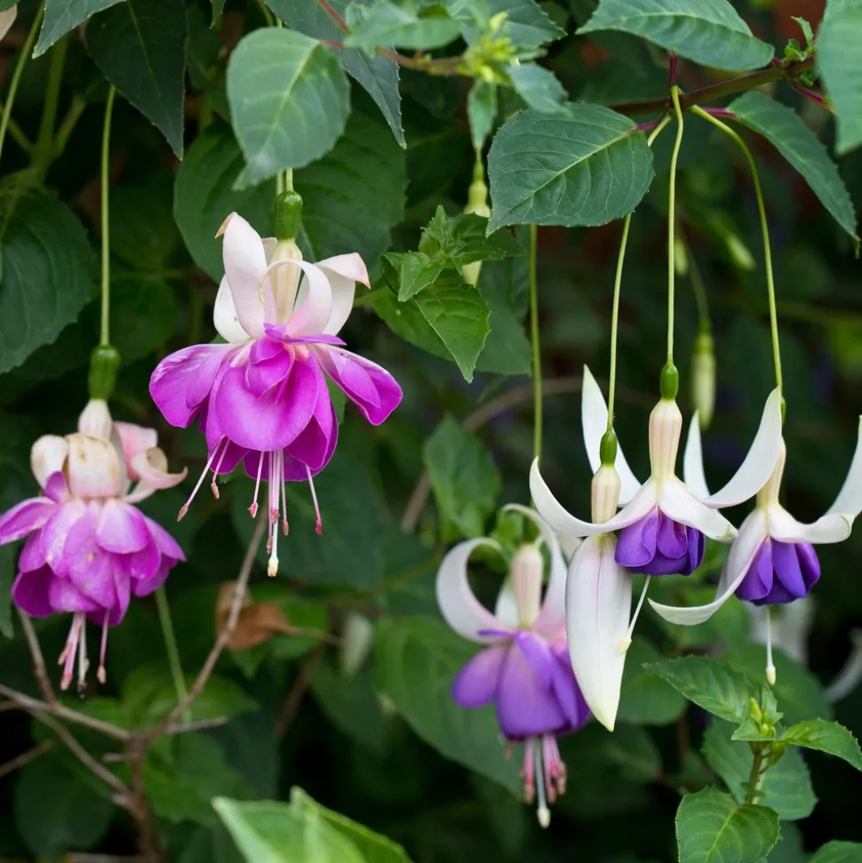 Très esthétique avec ses nombreuses clochettes retombantes, ce type de fuchsia se démarque surtout par l’harmonie de ses couleurs. Sa collerette blanche enveloppe merveilleusement bien son bouquet de pétales violets. Un abondant feuillage vert sombre distingue également cette plante.