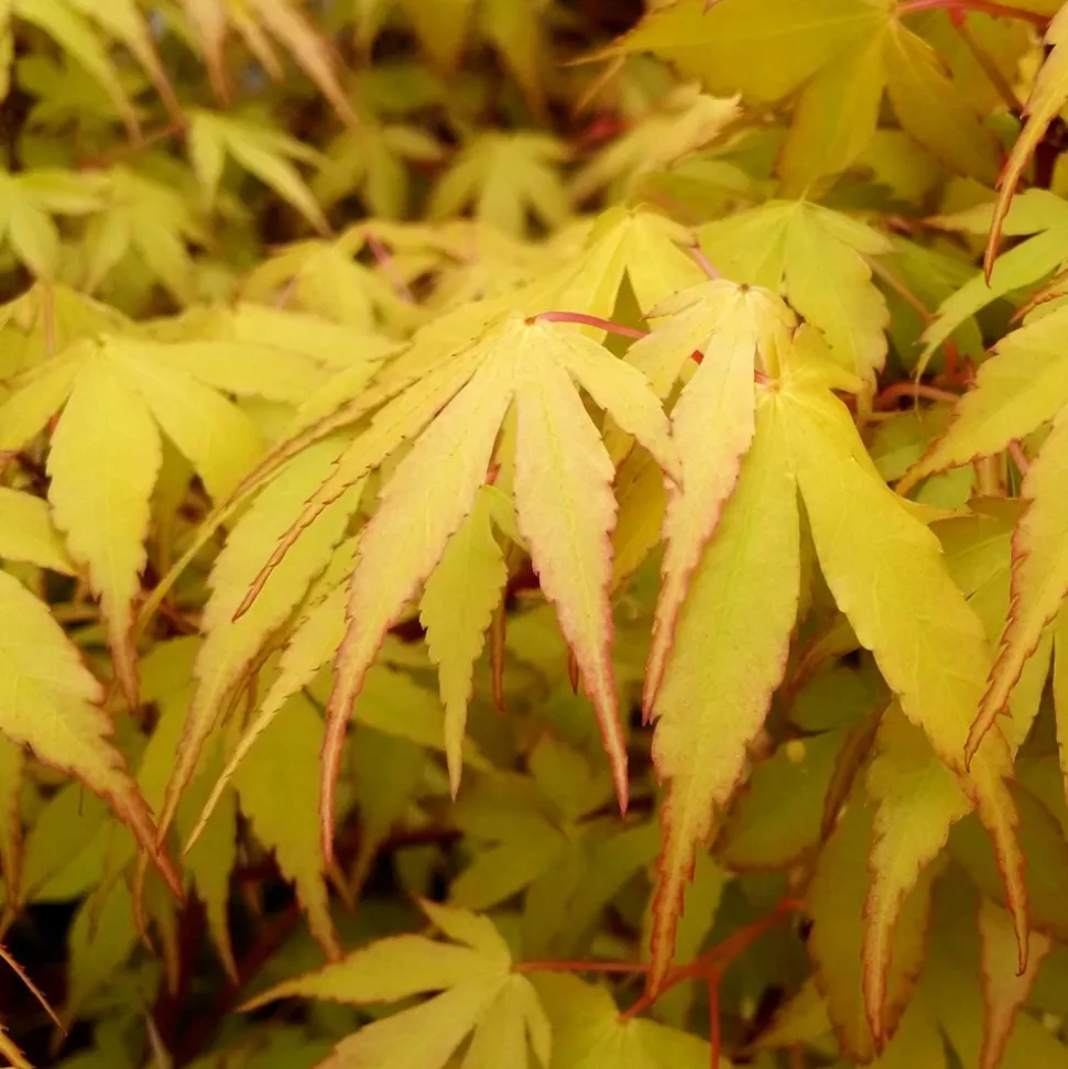 L’érable du japon Katsura, aussi connu comme <> appartient à la famille des érables du Japon. Il trouve son origine au Japon, en Chine et en Corée, et s’est introduit en Europe au 19e siècle. Au terme de croissance, cette espèce se développe assez rapidement et peut atteindre jusqu’à une hauteur de 2,50 m et d’une envergure de 2 m. Son feuillage caduc changeant en fait sa particularité. En effet, celui-ci présente une succession de feuilles dorées aux bords rouge-orangé au printemps, qui virent au vert clair en été et prennent une teinte rougeâtre à l’automne. Ses feuilles luxuriantes sont concentrées à son sommet, dont chacune se compose de 5 lobes allongés et dentelés. Sa floraison a lieu de mai à juin et dans certains cas, de petits fruits appelés <> peuvent apparaître.
