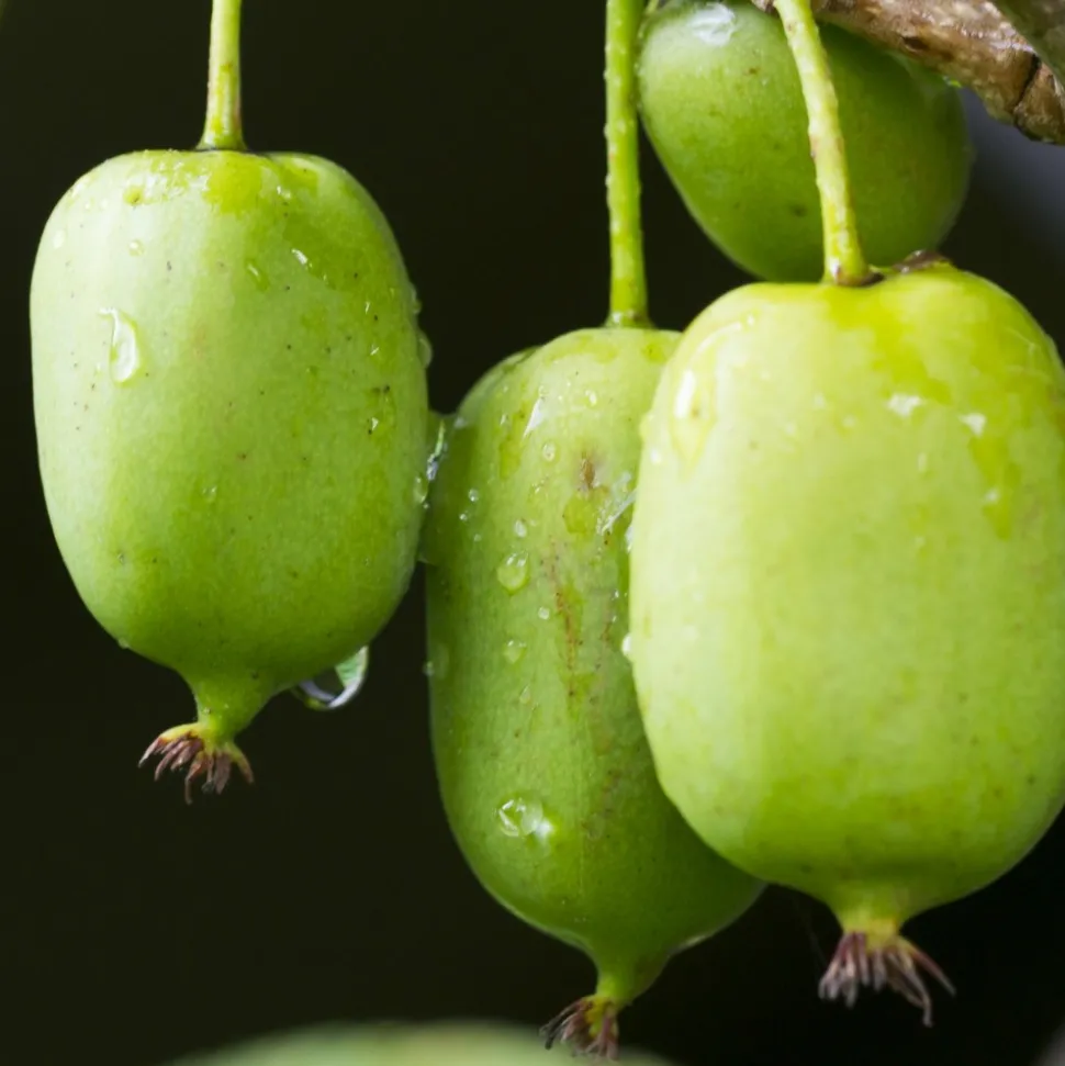 Également appelé Actinidia arguta Issai, le Kiwi Issai est une plante unique en son genre. Contrairement à son cousin plus connu, le kiwi <>, cette espèce est une variété autofertile, ce qui signifie qu’il n’a pas besoin d’un pied mâle à proximité pour polliniser et porter des fruits. Ses petits fruits verts, mesurant environ 2,5 cm de long, sont une explosion de saveurs, plus sucrées que les kiwis traditionnels, avec une peau si fine qu’elle peut être consommée sans épluchage. Son autre atout repose sur sa robustesse. En effet, cette plante peut résister au froid, capable de supporter des températures allant jusqu’à -30°C.