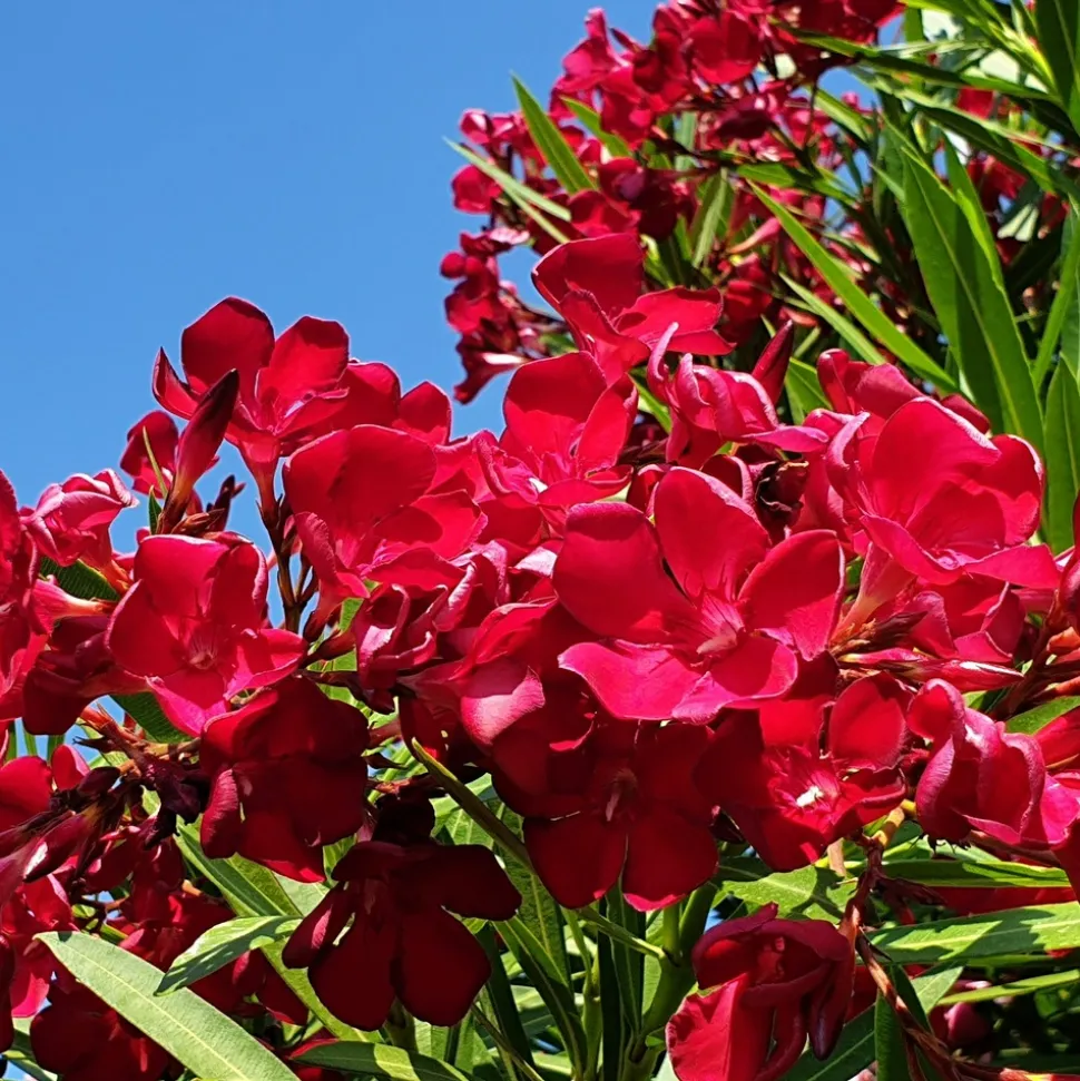 Le laurier-rose rouge se caractérise par ses feuilles étroites, allongées et d’un vert luisant, offrant un contraste saisissant avec ses fleurs qui s’épanouissent de la fin du printemps jusqu’à l’automne. Ces fleurs rouges sont généralement réunies en grappes, créant un spectacle visuel épatant. De plus, leur parfum sucré est tout simplement enivrant, attirant de nombreux insectes pollinisateurs, tels que les papillons et les abeilles.