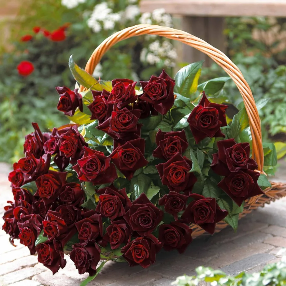 Rosier buisson mondialement connu, créé en 1954 et dont les fleurs très élégantes d’un coloris rouge grenas velouté très foncé dont les reflets en fonction de l’éclairage peuvent donner l’illusion d’une rose noire, font partie des roses les plus vendues en bouquet. Portées par de longues tiges, elles se renouvellent sans discontinuer de mai-juin aux gelées chaque année et composent des bouquets remarquables pour la maison.