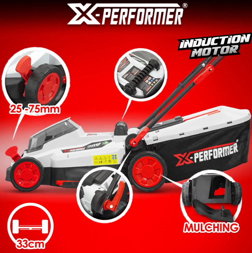 Prévue pour la tonte de petits terrains, cette tondeuse à gazon sans fil de la marque X-Performer est équipée d’un moteur à induction lui garantissant une meilleure durés de vie. Elle dispose d’une largeur de travail de 33 cm et d’un bac récolteur de 30 litres. Vous pouvez à tout instant ajuster la hauteur de coupe sur 5 positions grâce à son système de réglage centralisé (25-75mm). Elle possède également une fonction mulching qui permet à votre gazon de garder son éclat. Son carter en polypropylène est très léger et ne demande que très peu d’entretien.
