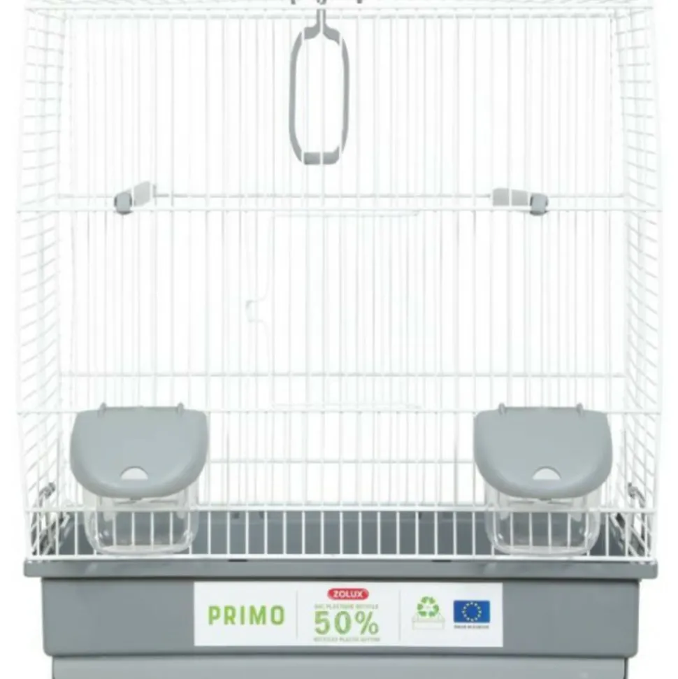 Cage en plastique éco-conçu pour oiseaux domestiques, coloris gris et blanc. Dimensions : 40 x 25,5 x 44 cm. Équipée de 2 perchoirs, 2 mangeoires et une balançoire, avec un tiroir pour un entretien facile. Poids : 1,37 kg.