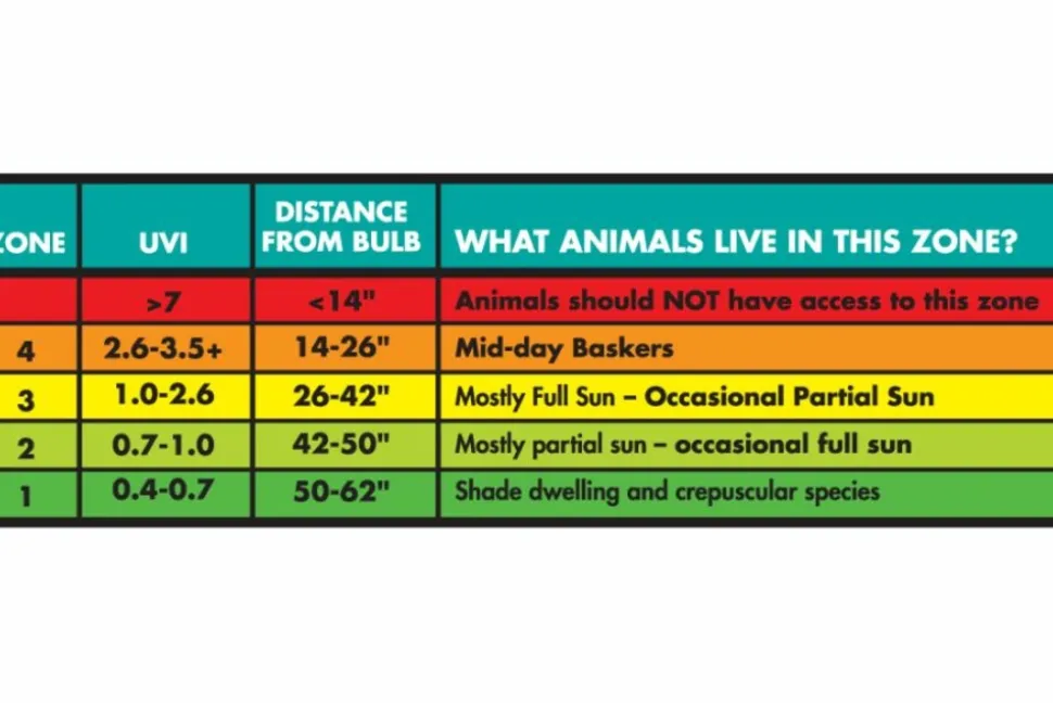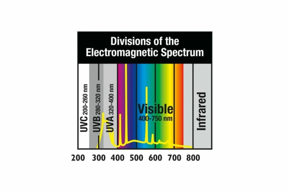 – Haute émission UVB (10%) : favorise la synthèse de la vitamine D3 indispensable à l’assimilation du calcium pour les espèces necessitant une forte exposition aux UVB