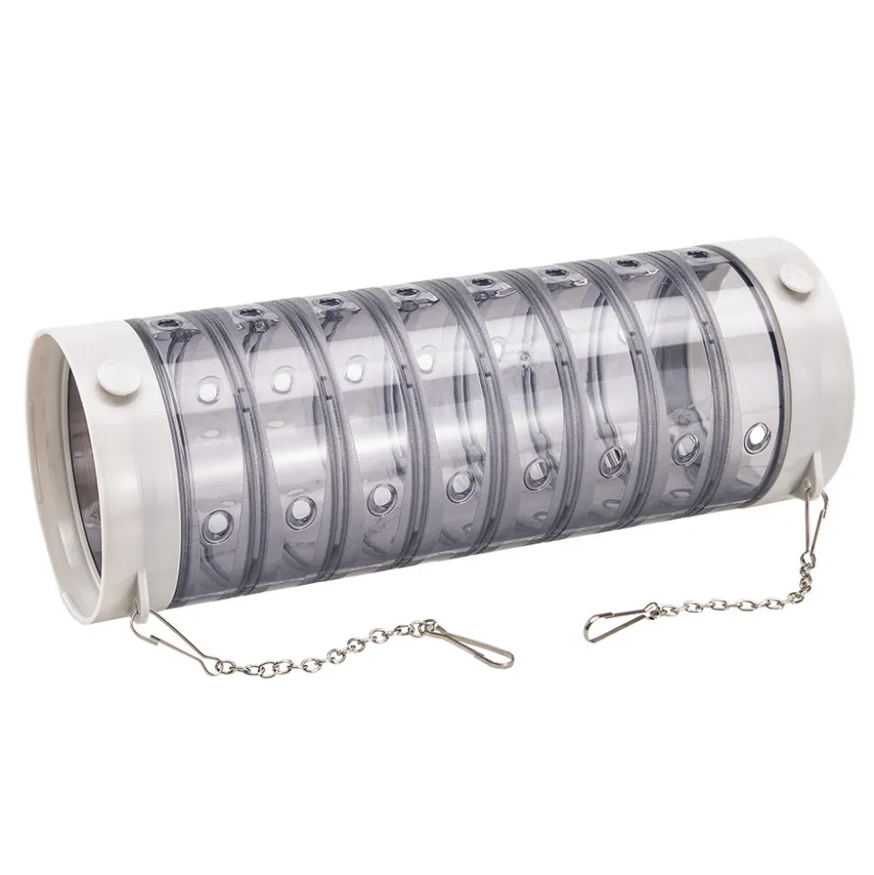 Le tube dispose de trous de ventilation interne et deux chaînes situées aux extrémités permettant de fixer la cage.