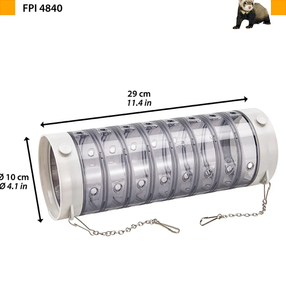 Tube en plastique pour furetsPour créer des parcours et des aires de jeuxAvec chaînes de fixation à la grilleAvec de petits trous pour la ventilation interneDiamètre : 10,5 cmLongueur : 29 cm