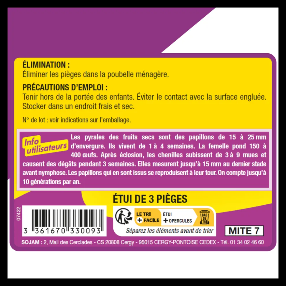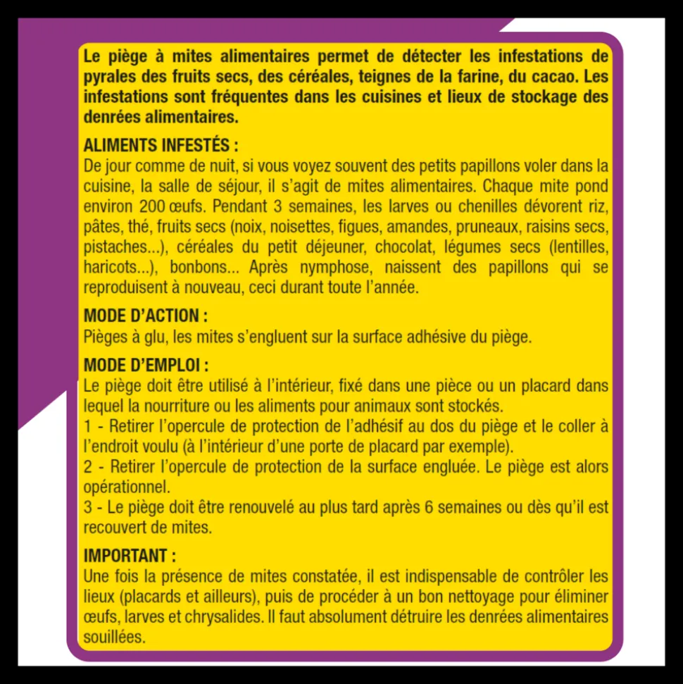 ACTO Pièges à Mites Alimentaires est une solution pratique pour détecter et éliminer les infestations de pyrales des fruits secs, teignes de la farine et du cacao. Conçus pour une utilisation dans les cuisines et les lieux de stockage des denrées alimentaires, ces pièges sont propres, sans odeur et sans insecticide, assurant ainsi la sécurité de votre environnement.Mode d’action:Le piège à glu d’ACTO capture les mites grâce à sa surface adhésive. Les mites sont attirées par le piège et s’engluent sur sa surface adhésive, les empêchant de se propager dans vos placards et de contaminer vos aliments.Mode d’emploi:Ouvrez le sachet en utilisant des ciseaux.Retirez le ruban de protection situé à l’arrière du piège pour exposer l’adhésif.Placez le piège à l’endroit désiré, tel qu’à l’intérieur d’une porte de placard.Retirez la pellicule de protection de la surface engluée. Le piège est maintenant opérationnel.Renouvelez le piège au plus tard après 6 semaines ou dès qu’il est recouvert de mites.Remarque importante:Dès que vous constatez la présence de mites, il est essentiel de procéder à un contrôle minutieux de vos placards et autres zones de stockage. Effectuez un nettoyage approfondi pour éliminer les 艙ufs, les larves et les chrysalides. Il est impératif de détruire les denrées alimentaires souillées afin d’éviter toute recontamination.Précautions d’emploi:Tenir hors de la portée des enfants.Éviter tout contact direct avec le produit.Stocker dans un endroit frais et sec pour garantir une longue durée de conservation.Protégez vos aliments des infestations de mites avec ACTO Pièges à Mites Alimentaires. Faciles à utiliser et efficaces, ces pièges vous permettent de maintenir un environnement sain et propre dans votre cuisine et vos lieux de stockage. Ne laissez pas les mites gâcher vos denrées alimentaires, optez pour ACTO dès maintenant.