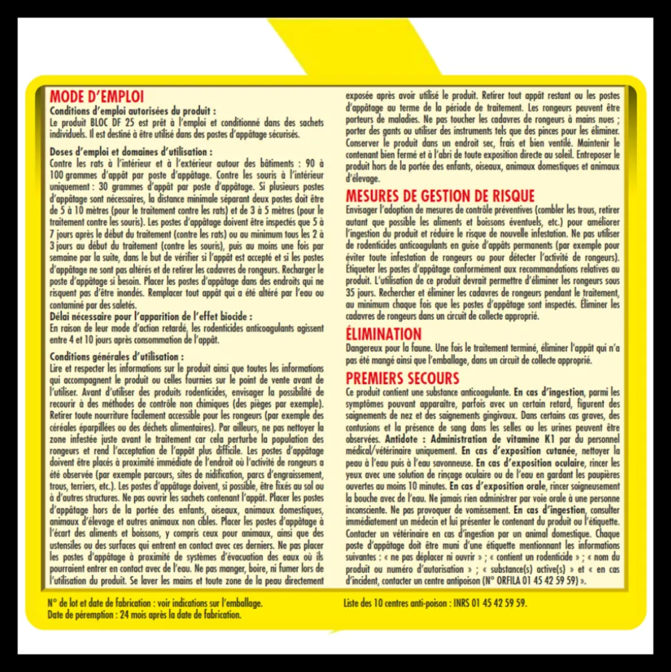 L’ACTO RATS – SOURIS Blocs appâts est conçu pour offrir une solution efficace contre les rats et les souris. Grâce à une formulation unique à base de céréales, liées par des graisses animale et végétale, ce produit attire facilement ces nuisibles. Le brodifacoum, un anticoagulant puissant, assure la mort des rongeurs par hémorragie interne en 4 à 10 jours, sans éveiller la méfiance des autres individus. Idéal pour les lieux humides comme les caves, sa composition hydrofuge lui permet de conserver son efficacité malgré l’humidité.Composition :Brodifacoum (CAS n° 56073-10-0) à 0,0012 % (m/m)Agent amérisantColorantHomologation : FANGA B + BLOC P – N° AMM FR-2017-0038 Rodenticide (TP14), appât en bloc (BB) prêt à l’emploi.Mode d’emploi :Utilisez dans des postes d’appâtage sécurisés.Dosage : 200g pour rats (intérieur/extérieur) et 40g pour souris (intérieur uniquement).Espacement des postes : 5-10m pour rats et 1-2m pour souris.Inspections régulières et rechargements au besoin.Suivez les instructions pour une application sécurisée.Conservation : Conserver dans un endroit frais, sec et bien ventilé, loin des enfants et animaux. Température maximale : 40°C.Utilisez les biocides avec précaution. Avant toute utilisation, lisez l’étiquette et les informations concernant le produit.