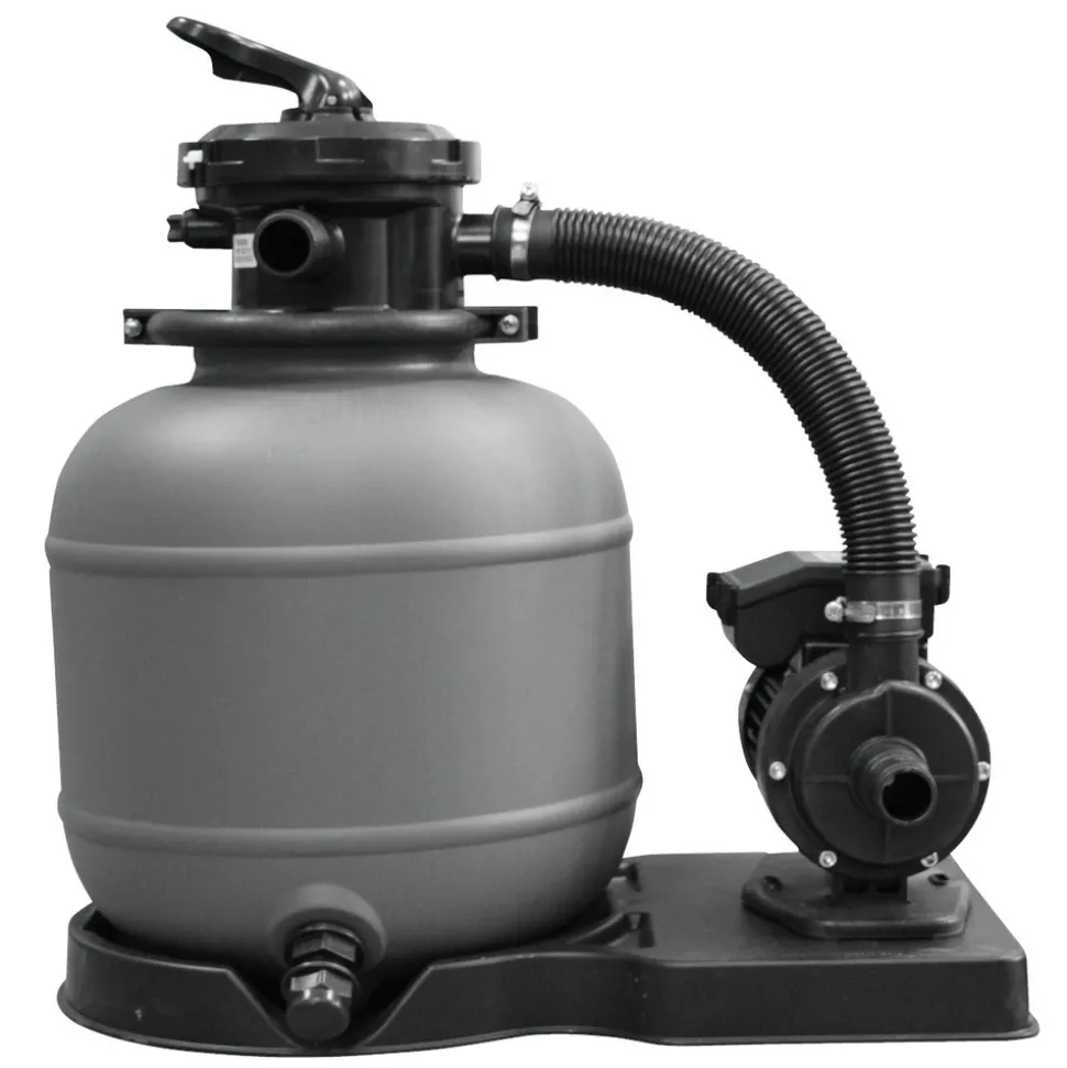 Fixé sur un seul et même socle, ce kit de filtration comprend un filtre à sable pouvant supporter une charge de 20 kg, une vanne 6 voies et une pompe.