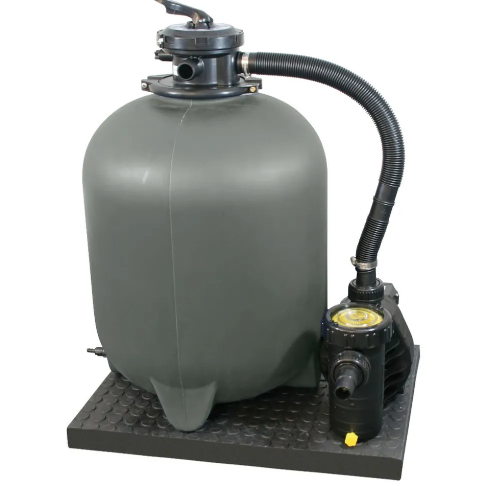 Fixé sur un seul et même socle, ce kit de filtration comprend un filtre à sable pouvant supporter une charge de 50 kg, une vanne 6 voies et une pompe.
