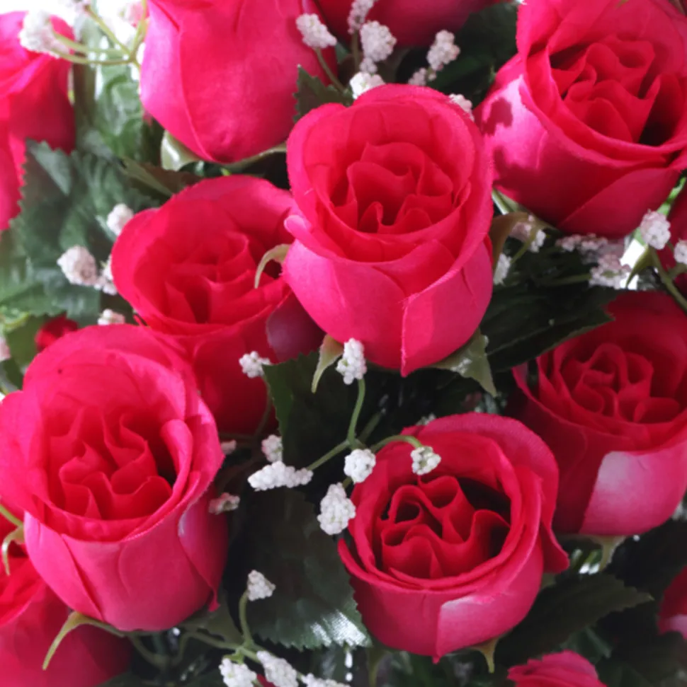 Très en vogue, les fleurs artificielles sont de plus en plus belles et d’un réalisme à s’y méprendre. Composer votre propre bouquet devient ainsi plus facile avec des plantes élégantes et durables. Autrefois, toutes en plastique ; elles sont davantage en textile aujourd’hui (principalement tergal et polyester) : ce qui leur confère une finition irréprochable et un toucher plus agréable, plus doux et moins froid. Quel plaisir de posséder chez soi et tout au long de l’année des plantes exotiques, des fleurs hors saison ou des bouquets plus vrais que nature et ce, quels que soient le climat, la luminosité ou l’absence d’entretien. Et oui, les plantes artificielles sont impérissables ! Ces fleurs artificielles sont disposées dans leur propre pot adapté, ce qui vous permet de les placer à l’endroit de votre choix dans votre intérieur. Fleurs artificielles – bouquet funéraire fuchsia D.28 H.46cm.