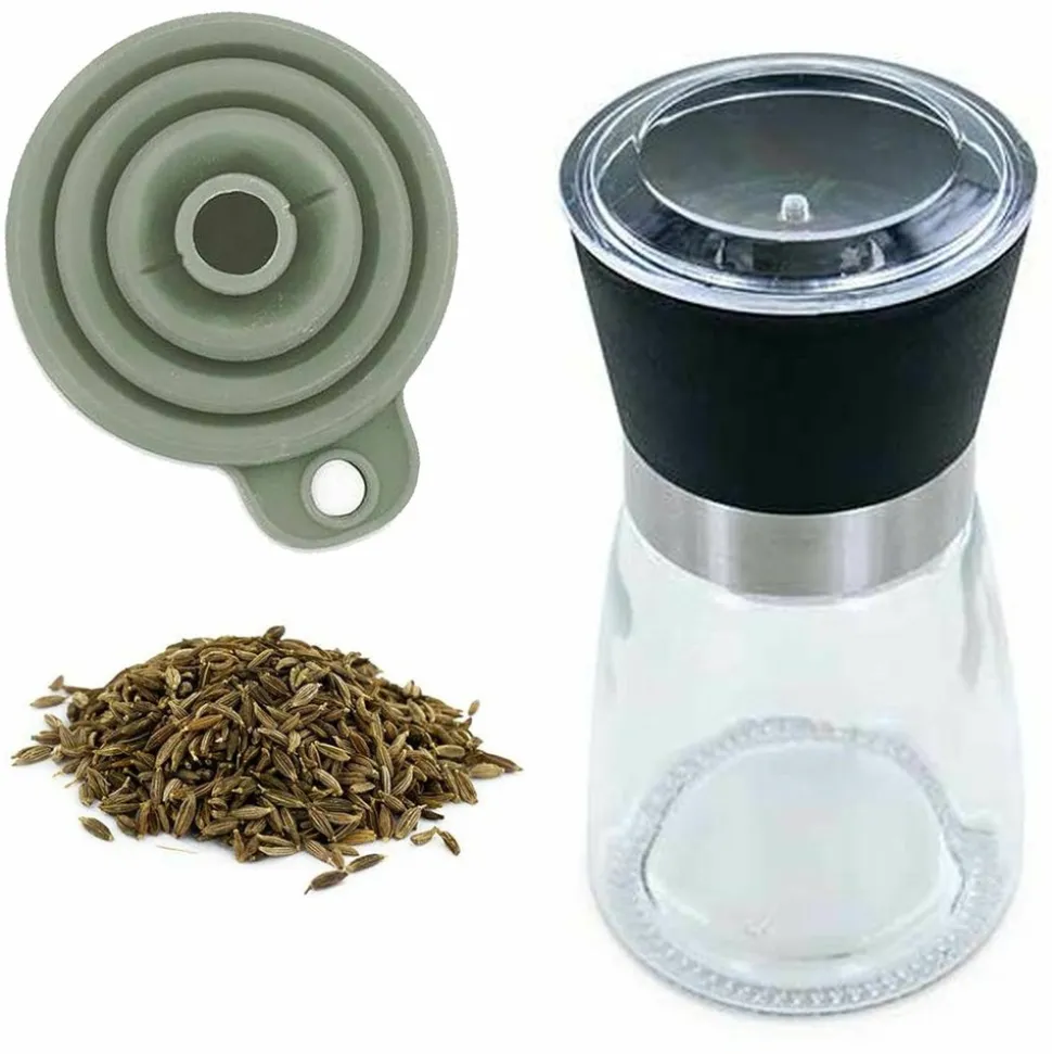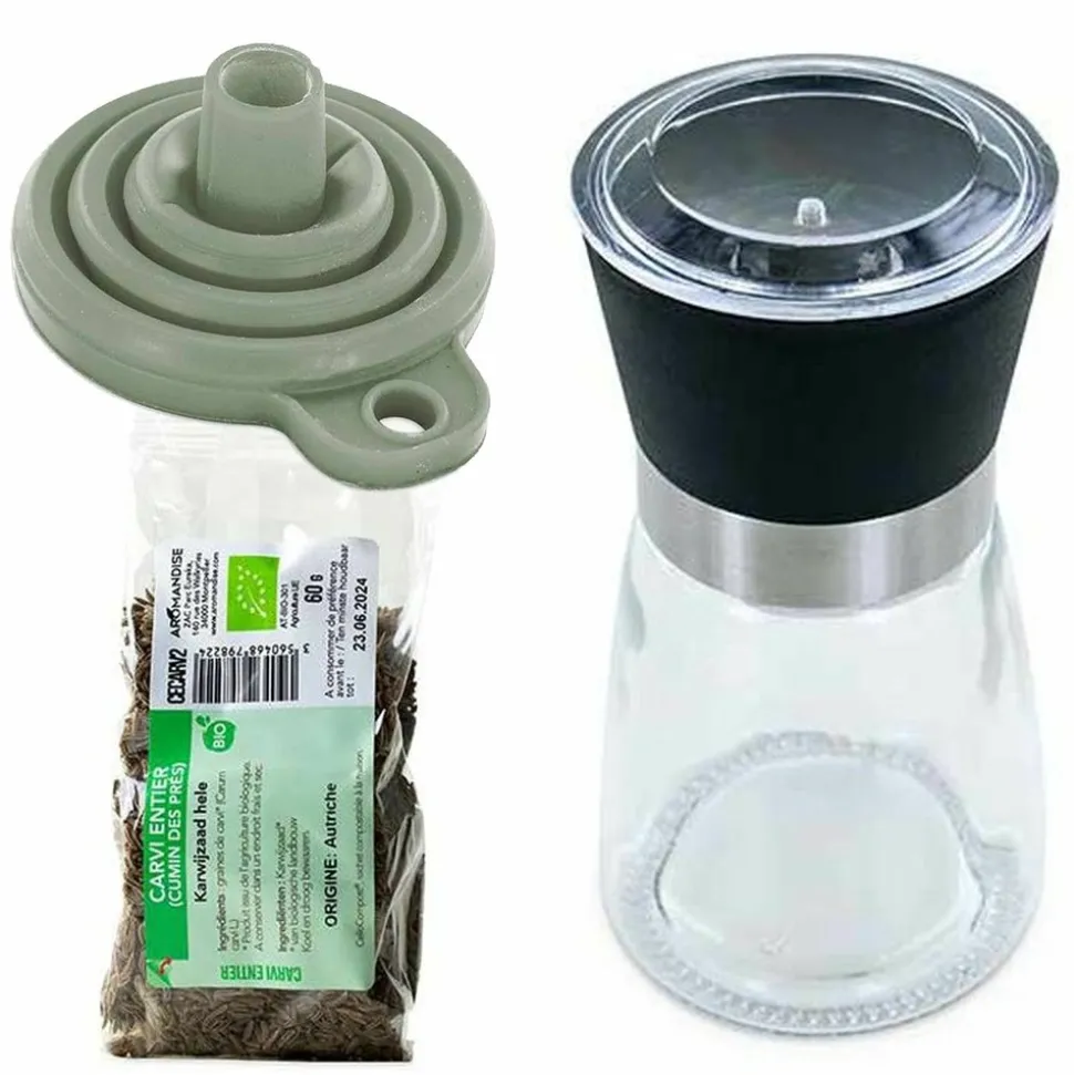 Moulin à épices, entonnoir et carvi entier bio. Cet élégant moulin à épices est maniable et facile à nettoyer à la main. Il est conçu en verre avec un mécanisme en céramique réglable en fonction du broyage souhaité. Hauteur 13 cm. Diamètre : 6 cm. Contenance 140 ml. L’entonnoir en silicone, facile à laver, permet de remplir votre flacon. Sa forme évasée permet de verser les épices et facilite leur descente dans le récipient. L’entonnoir est pliable et prend donc très peu de place dans les placards, vous pouvez aussi le transporter. Emballé dans une boîte en carton recyclé. Hauteur 7 cm. Diamètre : 7,5 cm. Le sachet de carvi entier bio est conditionné en sachet dégradable 60 g. Cette protection transparente biosourcée à partir de cellules végétales permet de préserver au mieux l’arôme du carvi, puis d’être compostée, pour une biodégradation en 90 jours seulement. Le sachet comprend une étiquette en papier repositionnable à coller sur le flacon : une fois chez vous, transvasez les épices dans un récipient adapté, puis collez l’étiquette dessus.