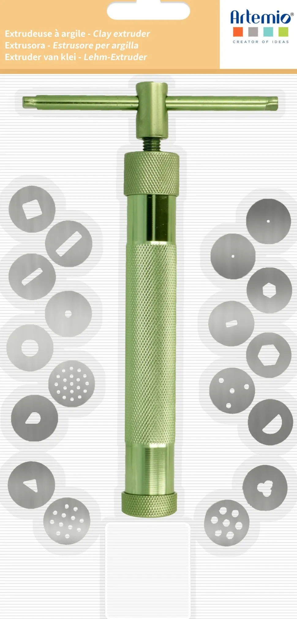 Un extrudeuse pour pâte à modeler mesurant 16,5 x 10 x 2 cm avec ses 20 diques de différents motifs géométrique mesurant 1,8 cm de diamètre; ll suffit d’introduire la pâte polymère à l’intérieur et de placer le disque de votre choix puis de tourner la manivelle pour que la pâte descente dans le cylindre, Idéal pour confectionner des décorations en pâte polymère