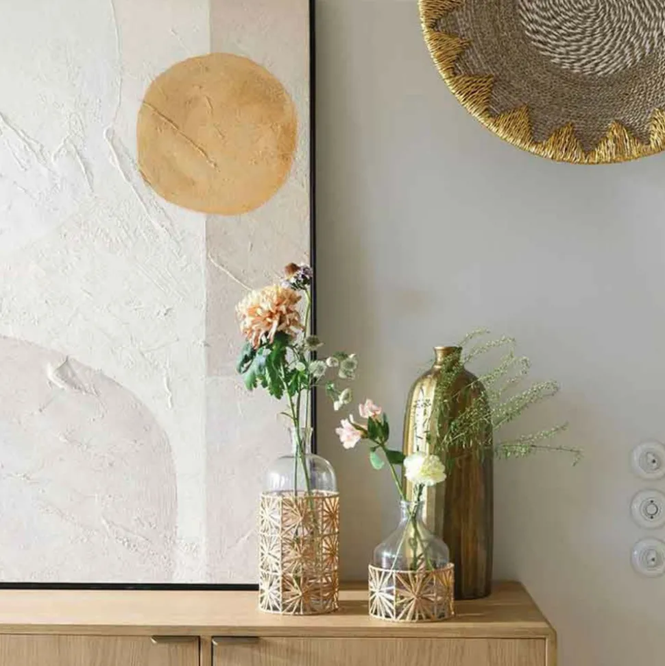 Ce magnifique vase est le mariage parfait entre le style classique et l’artisanat contemporain, offrant à votre intérieur un élément de décoration distinctif et raffiné. Fabriqué à partir de verre de haute qualité, ce vase bonbonne est non seulement robuste, mais il met également en valeur la beauté naturelle des fleurs et des arrangements floraux. Le raphia beige tissé avec soin autour du vase ajoute une texture subtile et une sensation organique, créant une esthétique chaleureuse et accueillante.