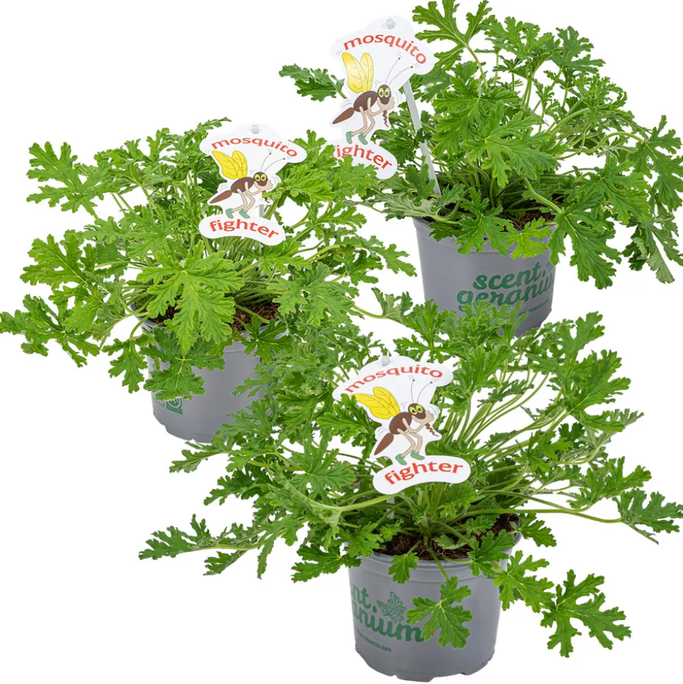 Fini les moustiques avec le Pelargonium Graveolens parfumé ! Le géranium citron est un anti-moustique naturel. Ne souffrez plus jamais de ces petits tueurs, lorsque ce géranium citron brille dans votre jardin. Les feuilles de ce géranium citron ont de petits poils. L’odeur de la plante est libérée par friction – en touchant simplement la plante et en frottant l’odeur sur vous-même, vous vous débarrasserez des moustiques en un rien de temps. Ce champion anti-moustiques est non seulement adapté pour garder les moustiques à l’extérieur, mais peut également être utilisé dans votre chambre.Caractéristiques- Livré par 3 pièces- La hauteur de livraison de cette plante est de 15-20 cm (mesurée du bas du pot de culture au sommet de la plante)- Livré dans un pot de culture de ⌀10,5 cm- Parfumé- Anti-moustiques- Pour l’intérieur et l’extérieur- Période de plantation : printemps – été- Période de floraison : Mai – Octobre- Plantes par m2 : 5 piècesSe soucier- Eau : En temps normal 1 à 2 fois par semaine et pendant les périodes chaudes prolongées 2 à 3 fois par semaine, dont quotidiennement en cas de sécheresse extrême (au moyen d’un tuyau d’arrosage ou d’un pulvérisateur)- Emplacement : Mi-ombre – soleil (maximum 4-6 heures d’ensoleillement par jour).- Entretien : Pour une éventuelle seconde floraison, nous conseillons de retirer les fleurs fanées. Pour une floraison extra riche, il est recommandé de mélanger régulièrement de la nourriture végétale dans l’eau d’irrigation en été.