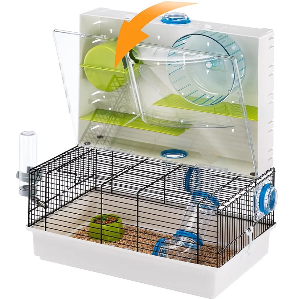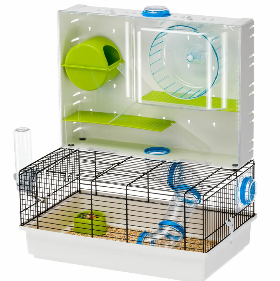 Double. La traditionnelle cage en métal est reliée, par un tube, à une section verticale avec tout le nécessaire pour le divertissement et l’exercice de votre petit ami : étagères, échelles de connexion, roue et même une petite maisonnette pour un repos bien mérité.