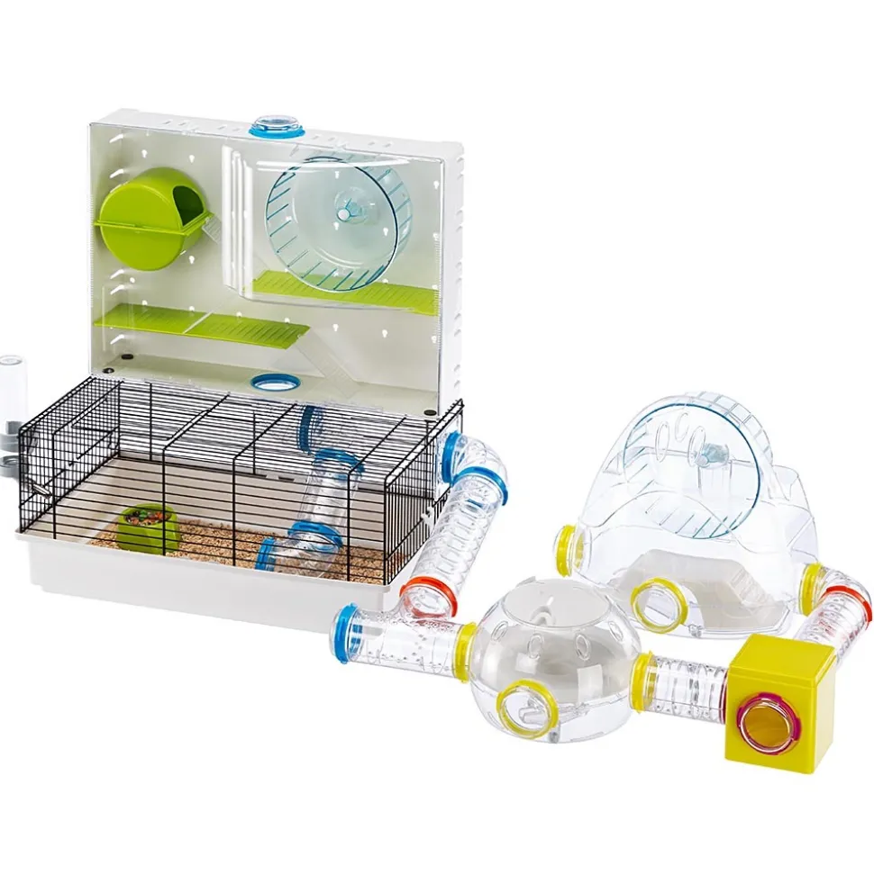 Cage modulable pour hamsters et sourisBac en plastique et grille en métal peint, reliés par des crochets latérauxAvec une grande aire de jeu verticale placée au-dessus de la cageCage et aire de jeux reliées par un tubeAccessoires inclus : 1 mangeoire, 1 abreuvoir, 2 étagères, 3 échelles, 1 roue, 1 nid et 1 jeu de tubes Prédisposée pour être raccordée par des tubes à d’autres cages ou habitats pour rongeurs