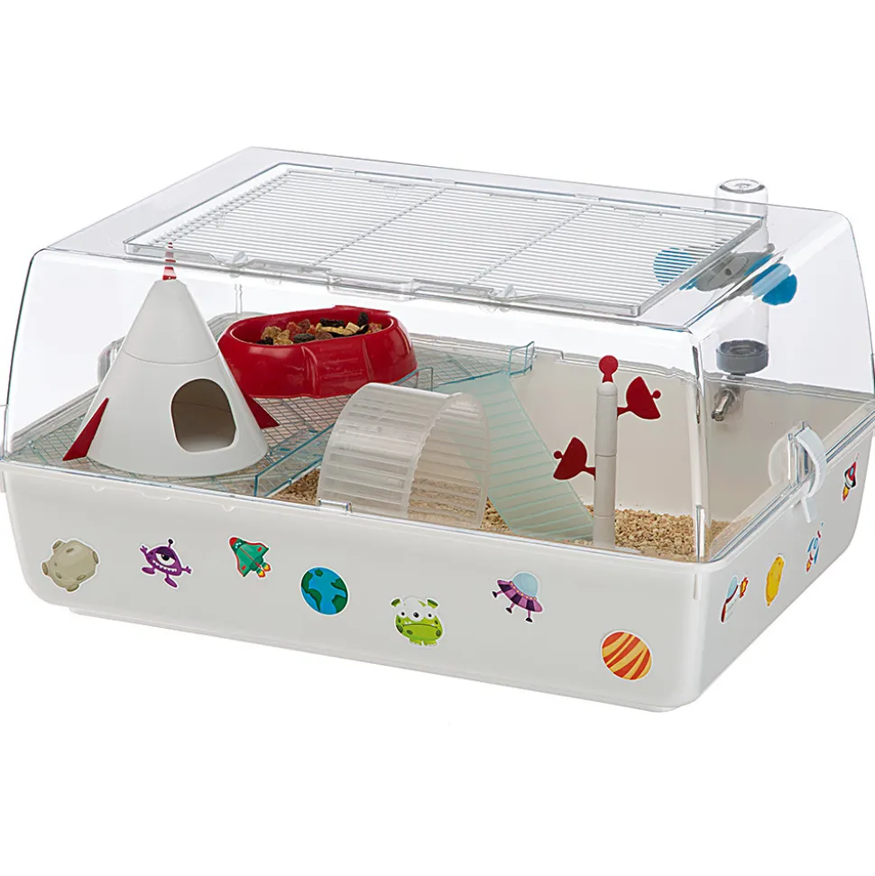 Cage en plastique robuste pour hamsters et souris avec décor sur le thème de l’espace Pour le passage correct de l’air sur le toit, il y a une grille métallique pouvant être ouverte et fermée grâce aux crochets spéciaux Bac et toit amovibles pour un nettoyage rapide et facile Dimensions complètes: 55 x 39 x h 27 cm Accessoires inclus: autocollants, 1 mangeoire, 1 abreuvoir, 1 étagère, 1 échelle, 1 roue, 1 maison et une décoration en forme d’antenne.