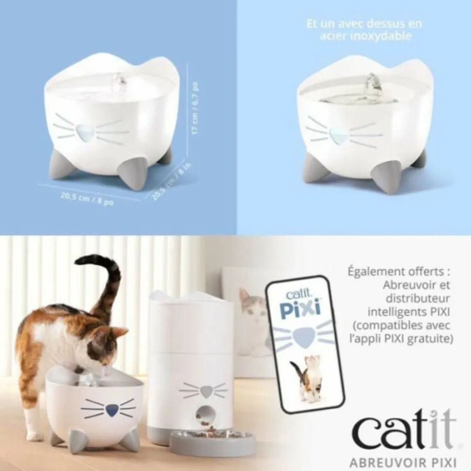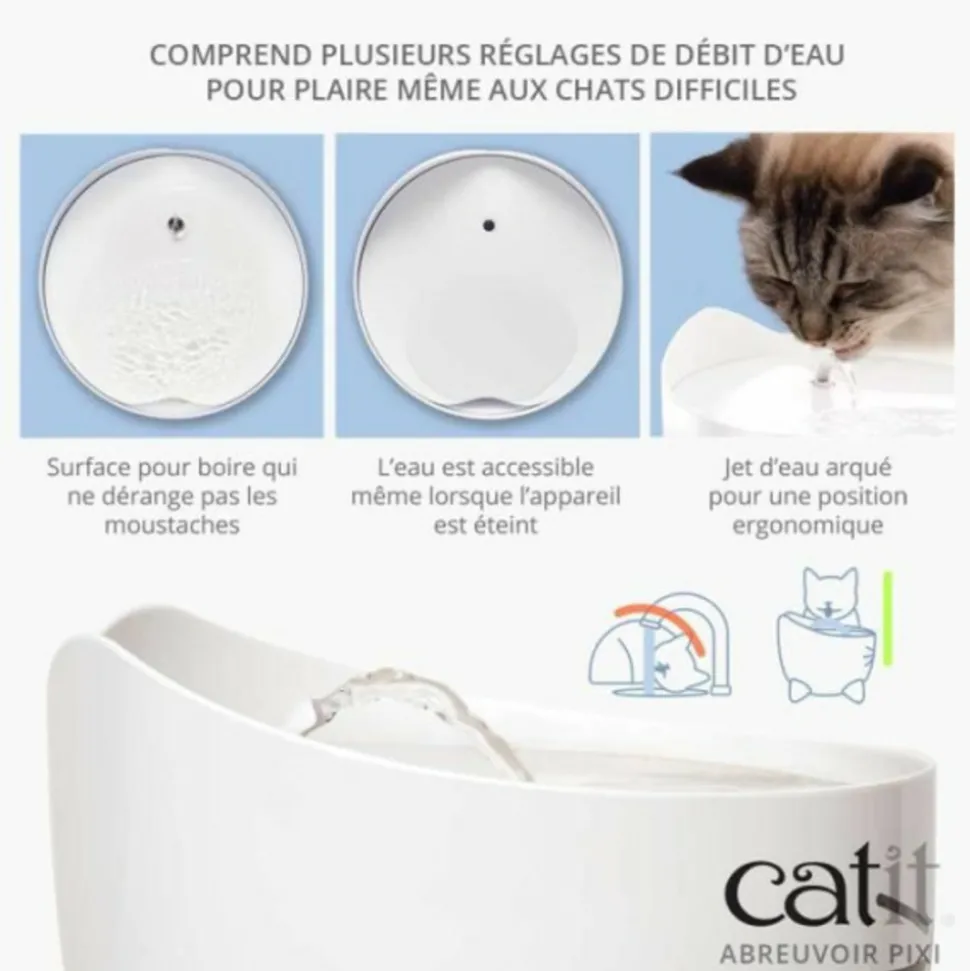 La fontaine a eau automatique pour chat CAT IT PIXI offre une source continue d’eau fraîche et pure pour encourager les chats a boire davantage et prévenir les maladies urinaires. Elle est équipée d’un filtre adoucissant l’eau et éliminant les débris, ainsi que d’alertes de statut a DEL et d’un arret automatique.
