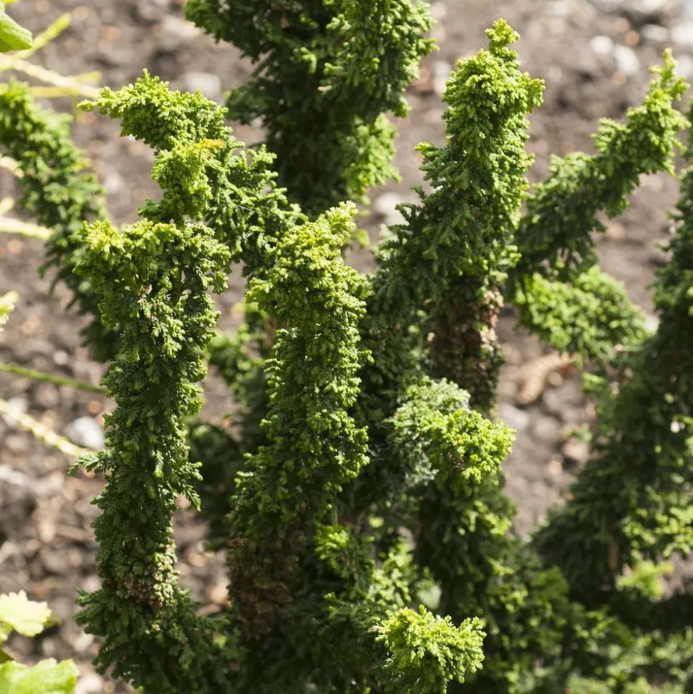 Le genre Chamaecyparis (Faux cyprès) comprend 7 espèces originaires d’Amérique du Nord et d’Extrême-Orient. Obtusa est l’une de ces espèces, originaire du Japon, introduite en Europe en 1862. ‘ Sheriman’ est une variété horticole. Ce conifère nain, au port érigé, à l’aspect insolite avec ses branches de différente hauteur, atteint 1,50 m de hauteur pour une largeur de 1 m. Aiguilles vert foncé. Pousse très lentement. A installer en isolé, en rocaille, dans un sol normal. Exposition au soleil ou à mi-ombre. Convient bien en pot, en bac. Pas de taille.