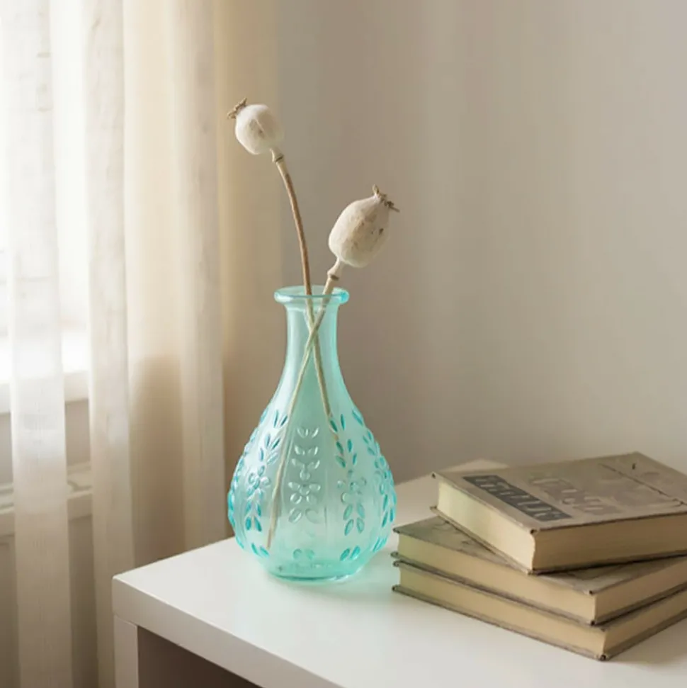 Ce vase en verre bleu à décor liseron se prête à une multitude d’emplacements pour sublimer votre intérieur.