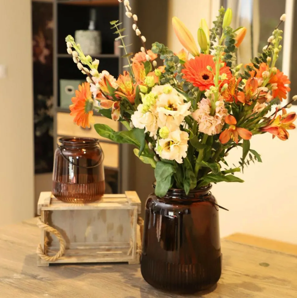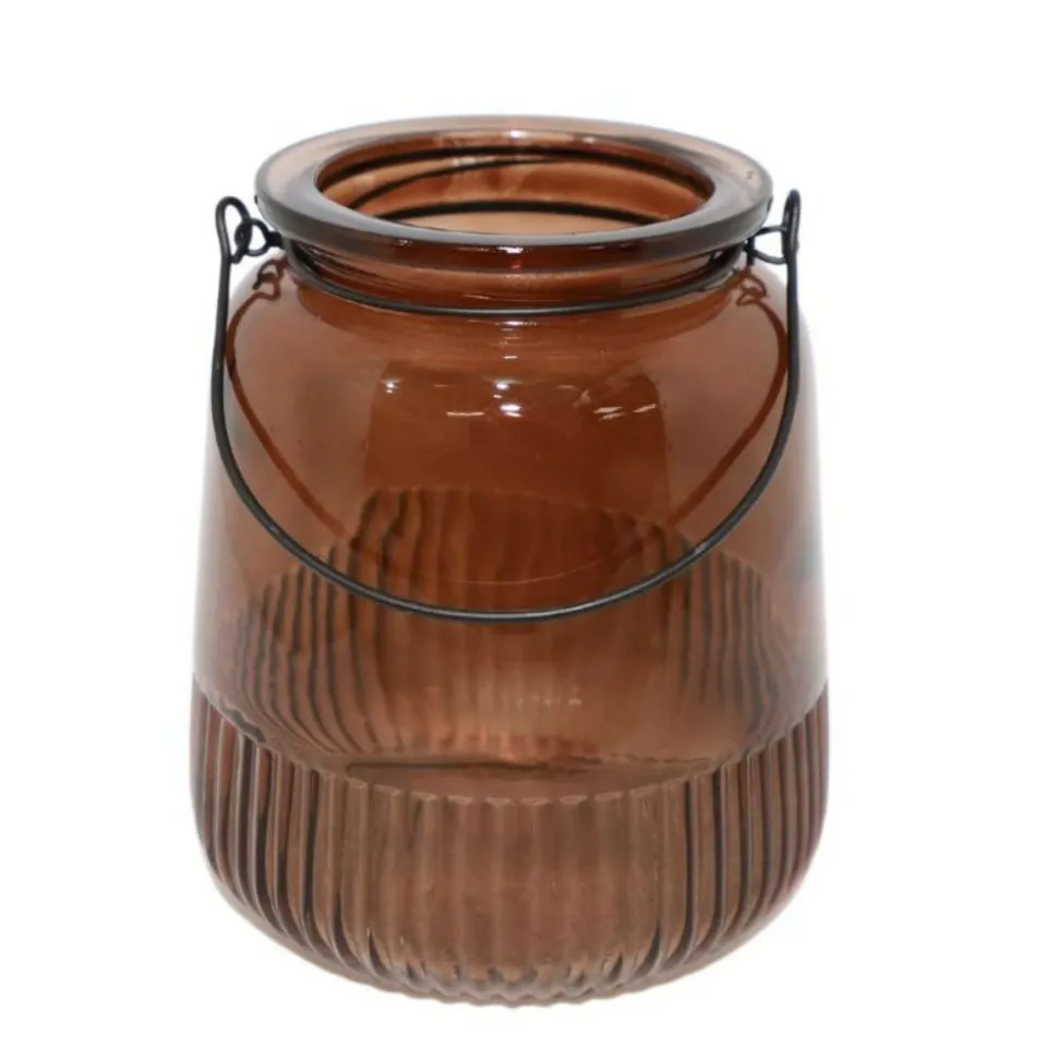 Matériau et avantages : Ce vase est fabriqué en verre marron transparent, mettant en valeur un motif en relief strié sur la partie basse, ajoutant de la texture et de la profondeur à son design. L’anse métallique noire apporte une touche moderne, créant un contraste subtil avec la chaleur du verre. La transparence du verre permet de laisser apparaître la lumière de manière douce, créant une atmosphère accueillante.