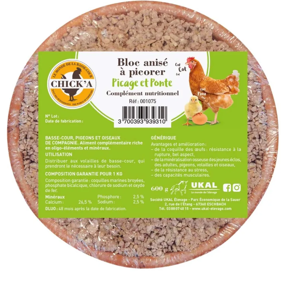 Complément alimentaire riche en oligo-éléments et minéraux pour volailles de basse-cour, pigeons et oiseaux de compagnie. 600 g Avantages et amélioration : de la coquille des oeufs : résistance à la rupture, bel aspect. de la minéralisation osseuse des jeunes éclos, des adultes (pigeons, volailles et oiseaux). de la résistance au stress. des capacités musculaires. Satisfait les besoins en sels minéraux et oligo-éléments de la basse-cour tout au long de l’année. Utilisation: Distribuer aux volailles de basse-cour, qui prendront le nécessaire à leur besoin. Composition : Coquilles marines broyées, phosphate bicalcique, chlorure de sodium, oxyde de fer. Disponible uniquement pour la France et la Belgique.