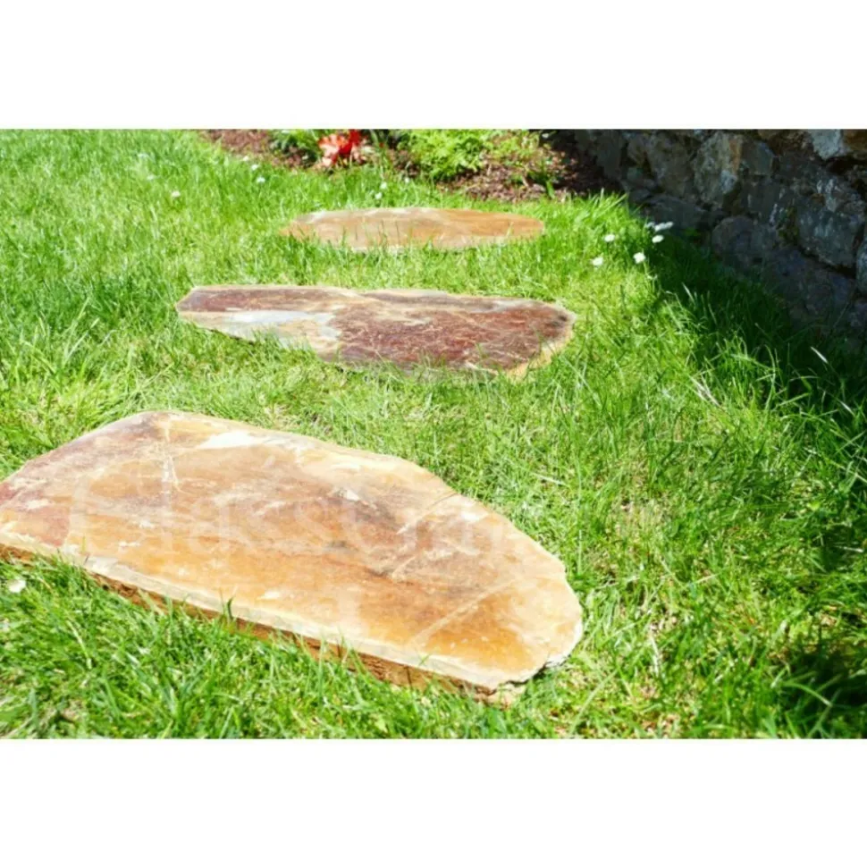 Des teintes grises mates sublimées par des reflets métalliques, en passant par une palette de rouges vers des tonalités marrons aux pigments profonds. Tracez un chemin au cœur de la pelouse. Dessinez la courbe de l’allée et disposez les dalles à fleur de gazon. Laissez environ 30 cm entre 2 dalles et votre allée prend vie pour l’éternité.