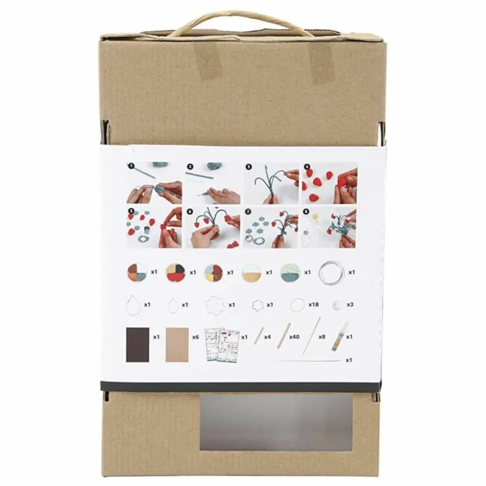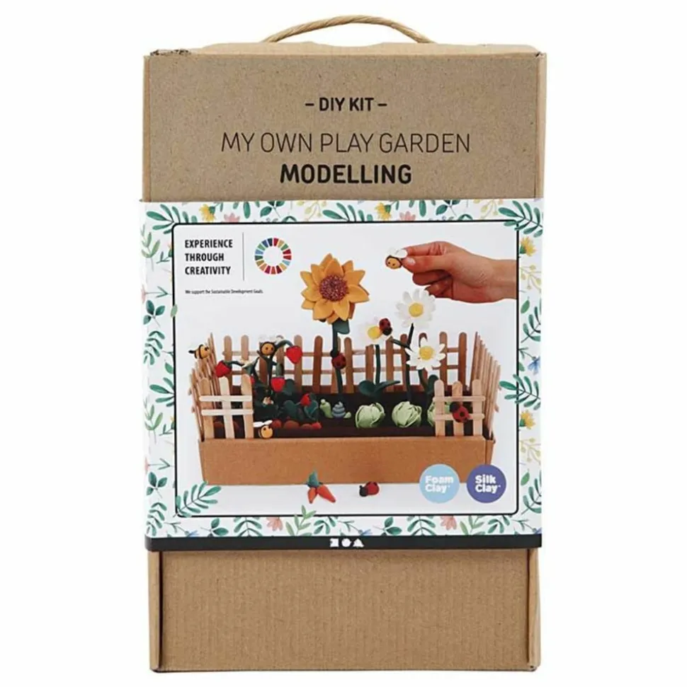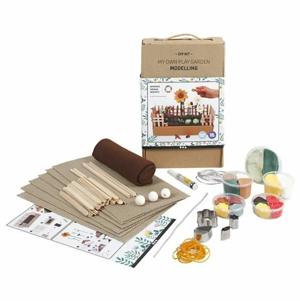 Pâtes à modeler Silk Clay®. Coffret d’initiation au modelage pour créer son propre potager en pâtes à modeler. Parfait pour une activité manuelle pour les enfants. Ils auront plaisir à modeler leur potager et à installer le décor avec les bâtonnets et les autres objets fournis dans le kit. Résultat super mignon garanti ! L’avantage de la pâte à modeler Silk Clay® est qu’elle est auto-durcissante, c’est-à-dire qu’elle se durcie à l’air libre. Vous verrez, l’utilisation est simple et les réalisations sont facilement jolies. Activité créative géniale à faire lors d’un goûter d’anniversaire ou lors de journées pluvieuses. Pâtes Silk Clay et Foam Clay de différentes couleurs. Boules de coton, fil d’aluminium, carton ondulé, feutre, élastique, bâtons de glace de différentes tailles, moules, colle.