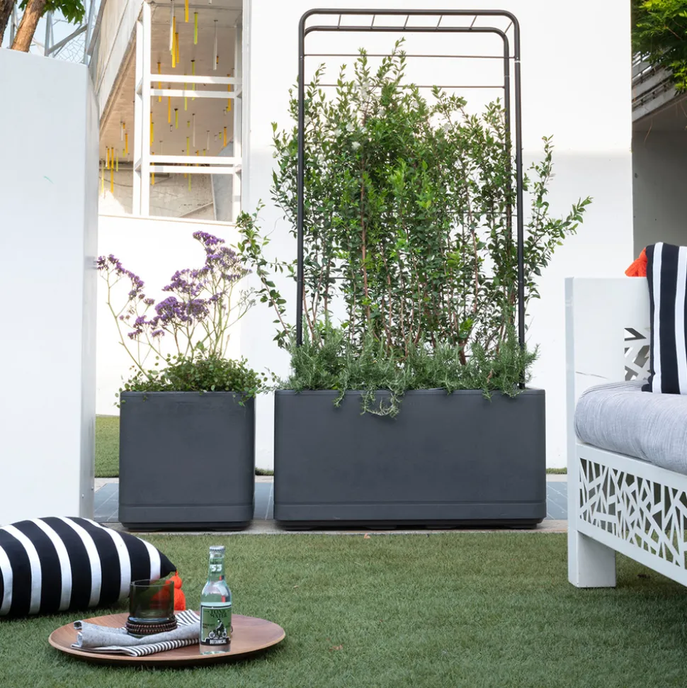 Découvrez la gamme Cosmo : des bacs en forme de cube, alliant élégance et fonctionnalité grâce à leur réserve d’eau intégrée. Fabriqué en France à partir de plastique issu du tri sélectif, ce bac de 74 L est la solution parfaite pour vos plantes d’intérieur et d’extérieur puisqu’il est équipé de roulettes. Grâce à son bouchon amovible et sa jauge de niveau, vous pouvez suivre en un coup d’œil si votre plante a besoin d’un petit arrosage. Son design épuré lui confère un look moderne qui s’intègrera parfaitement dans votre foyer. De plus, sa résistance au gel et aux UV garantit une durabilité remarquable. Grâce à ses roulettes, vous pourrez facilement mettre vos plantes et agrumes à l’abri du gel ! Dimensions : L.78xl.38xH.39cm. Bac muret Cosmo, à réserve d’eau, coloris anthracite – L.78cm.