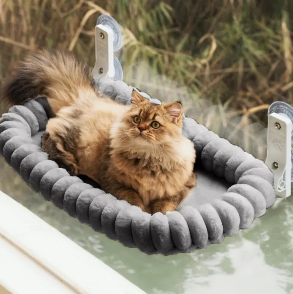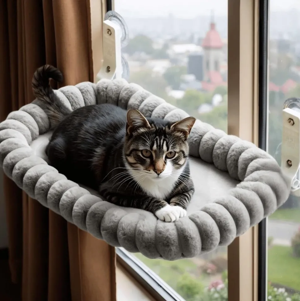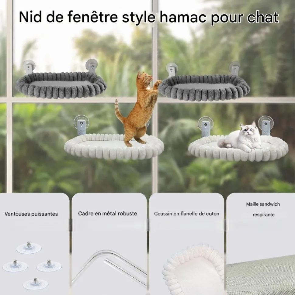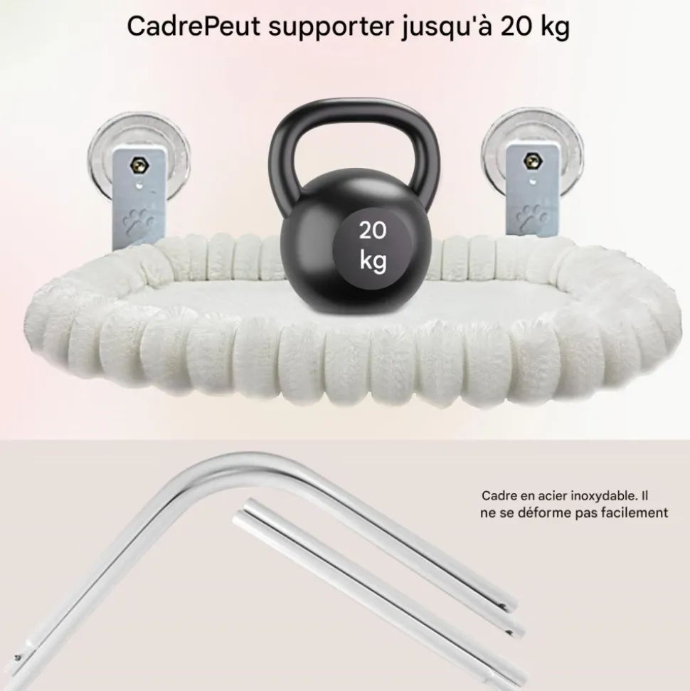 - Confort maximal : Le hamac propose un tissu pelucheux doux, avec un design ergonomique pour soutenir la tête et le cou du chat, parfait pour les siestes au soleil.