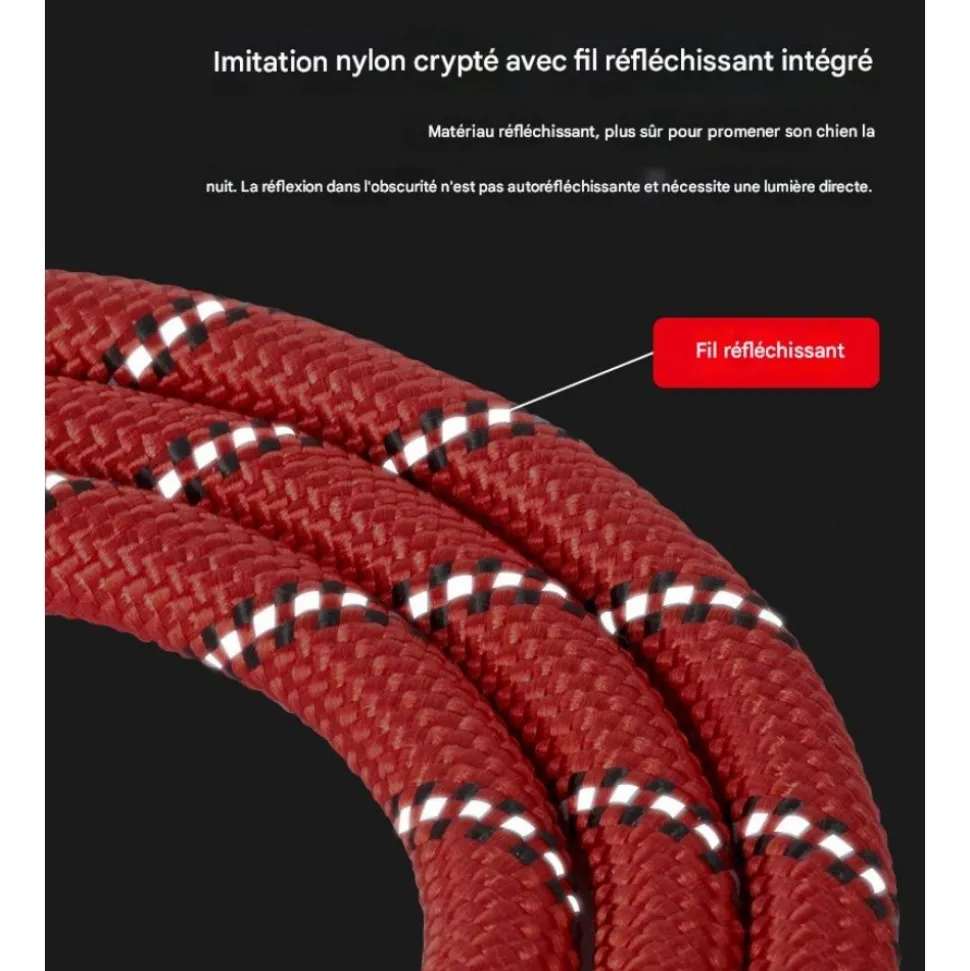 - Matériau réfléchissant : Le matériau réfléchissant améliore la visibilité de votre chien pendant les promenades de nuit, assurant sa sécurité.