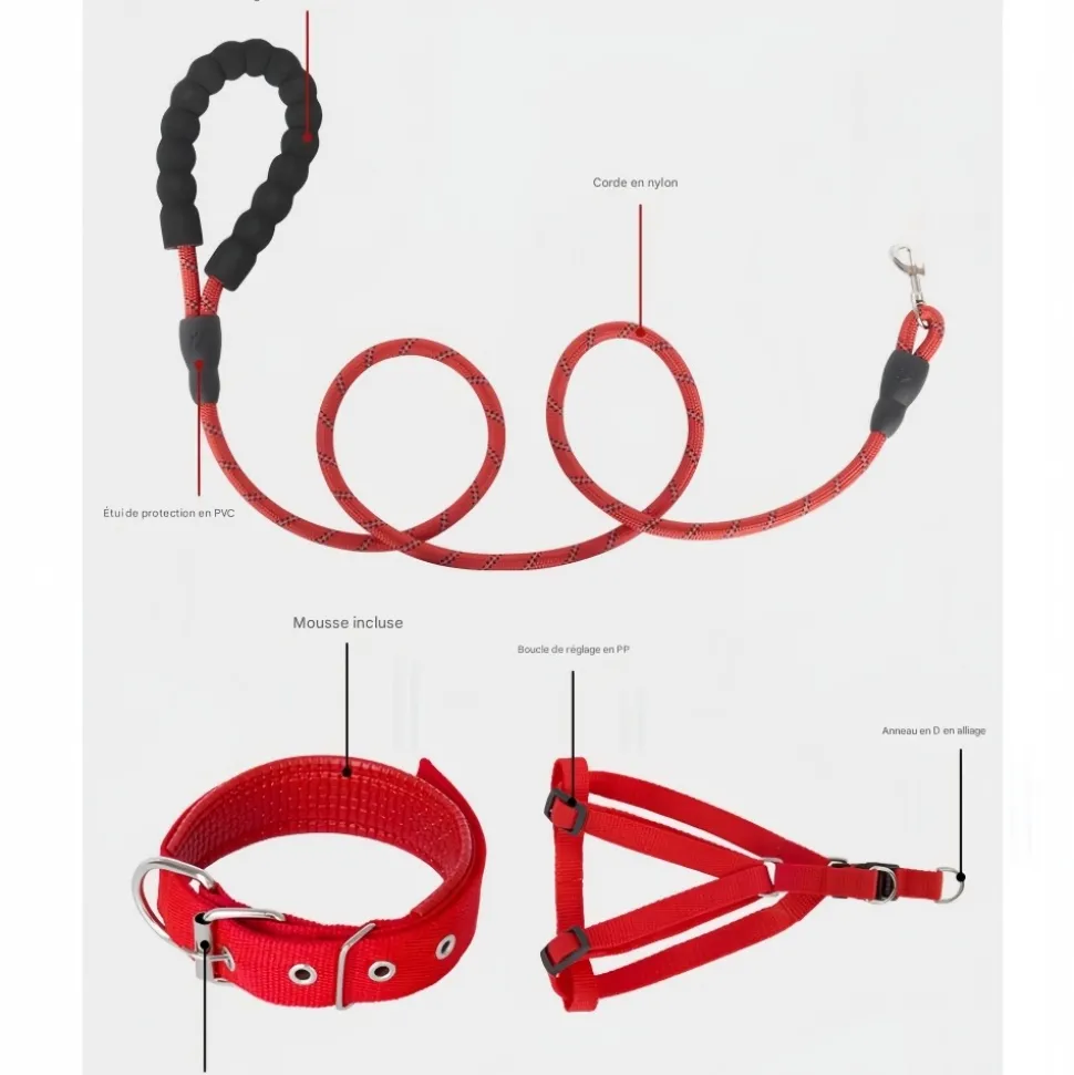 - Ensemble complet : Comprend une laisse de 1,5 m, un collier et un harnais de poitrine, offrant tout ce dont vous avez besoin pour promener votre chien.
