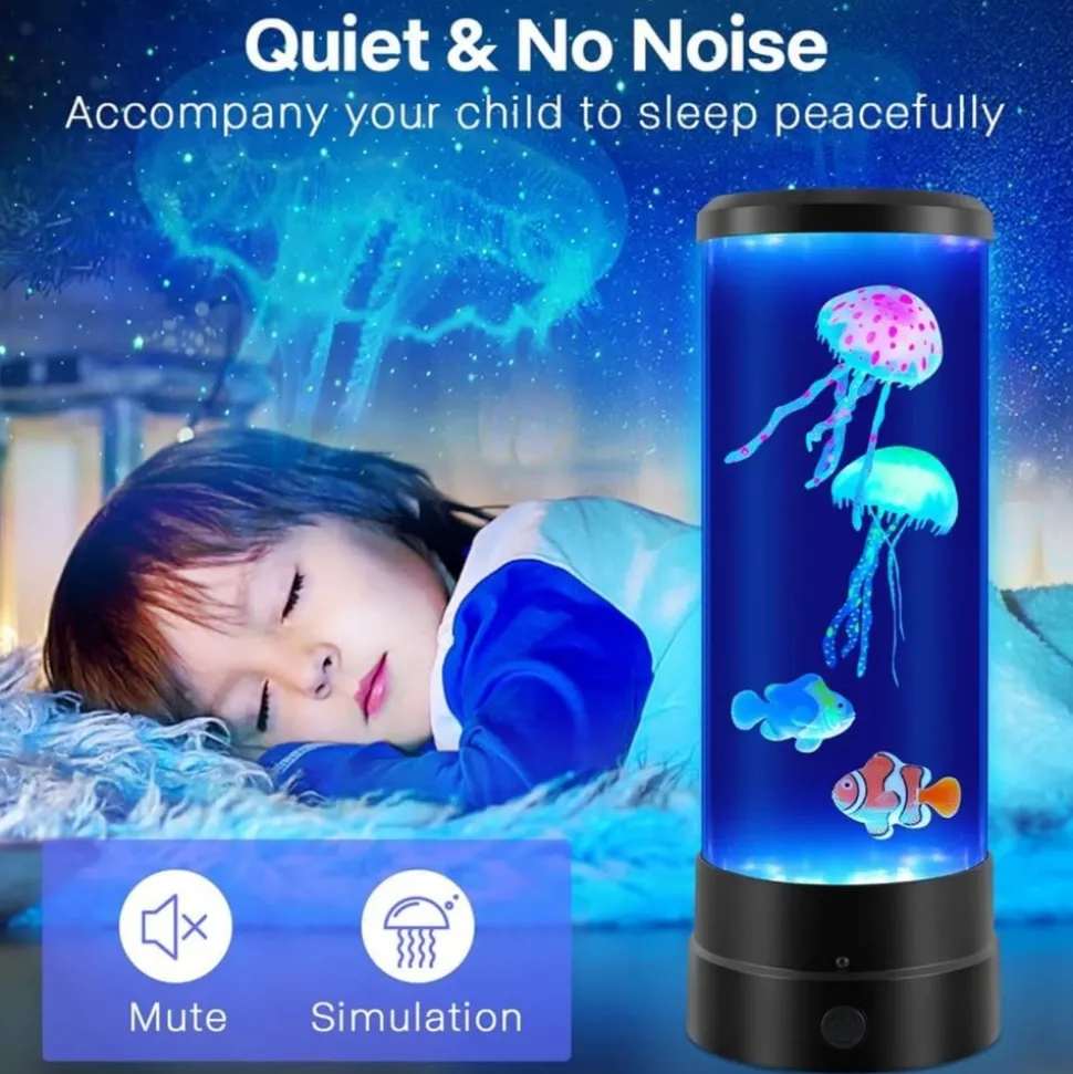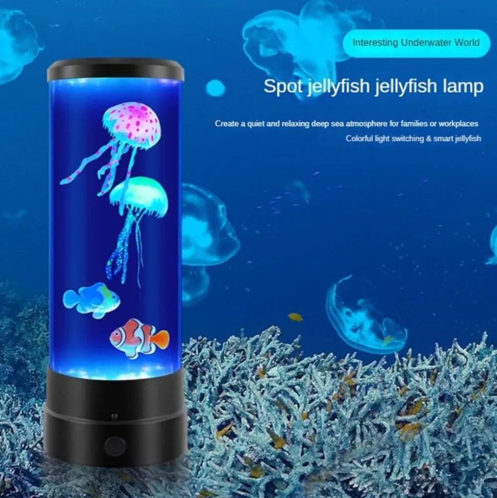- Cette lampe méduse présente deux mignons petits poissons et deux belles méduses nageant librement dans une transparente et pure. Le débit d’ au fond du réservoir permet aux créatures de se déplacer sans rester coincées dans la pompe. être un faux aquarium, il offre une expérience sous-marine réaliste qui ressemble à un grand aquarium de méduses.