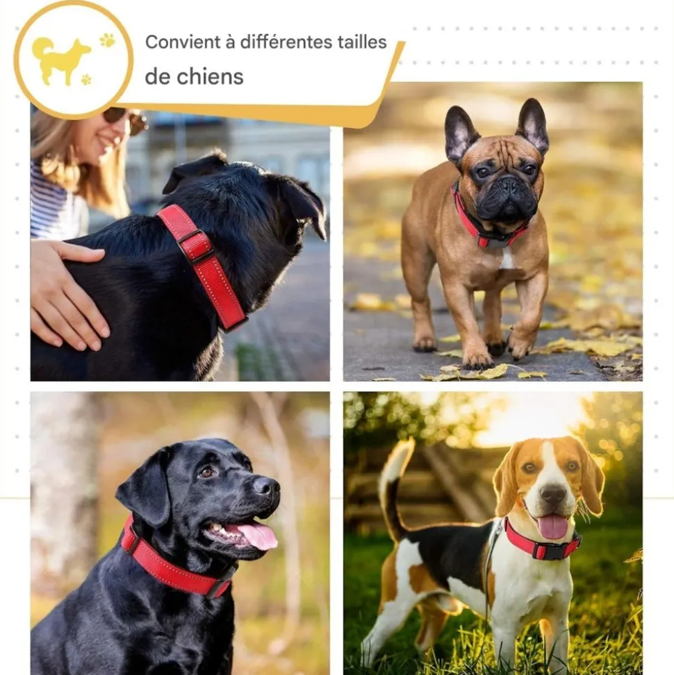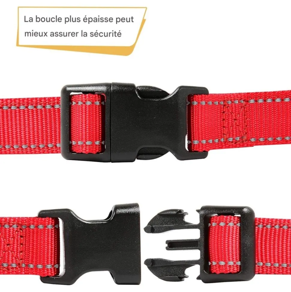 Matériaux de qualité : Le collier est en nylon durable et néoprène rembourré, doux et amical pour la peau du chien.Boucle de sécurité : Boucle ABS de haute qualité avec dégagement rapide et anneau en D robuste, facile à ajuster.Sécurité nocturne : Les sangles réfléchissantes améliorent la visibilité la nuit, protégeant le chien des dangers potentiels.Utilisation variée : Idéal pour l’usage quotidien et d’autres activités, donnant au chien un look mignon et élégant.
