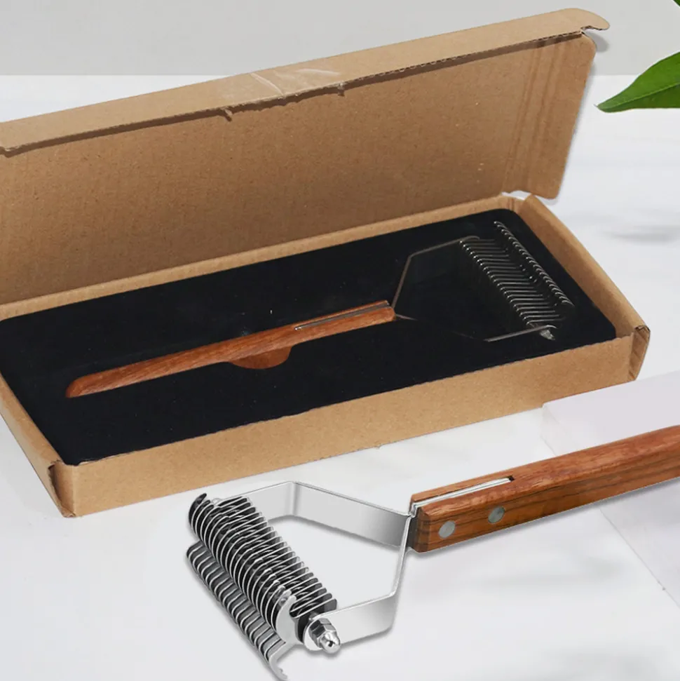 Conçu spécifiquement pour le soin des poils de chien, ce peigne démêlant allie un design supérieur à une fonctionnalité pratique. Le manche en bois épouse la courbe de la main, apportant une expérience de maintien chaleureuse et confortable, de sorte que vous ne vous sentirez pas fatigué même lorsque vous peignez les poils de votre chien pendant une longue période.La lame double face est en acier inoxydable, qui est durable et ne rouille pas facilement. Une extrémité est conçue pour les poils emmêlés tenaces. Les dents du peigne sont astucieusement conçues pour s’insérer en douceur dans la zone emmêlée, dénouer délicatement le nœud et minimiser l’inconfort du chien. L’autre extrémité est axée sur l’épilation, avec des dents de peigne fines qui peuvent capturer efficacement les cheveux perdus pour les empêcher de tomber dans la maison.Comparé aux peignes ordinaires, sa conception de lame double face est plus ciblée et le manche en bois ajoute du confort d’utilisation. Qu’il s’agisse de soins capillaires quotidiens ou de problèmes d’enchevêtrement et d’épilation, il peut facilement gérer la tâche et constitue une bonne aide pour le soin des poils de chien.