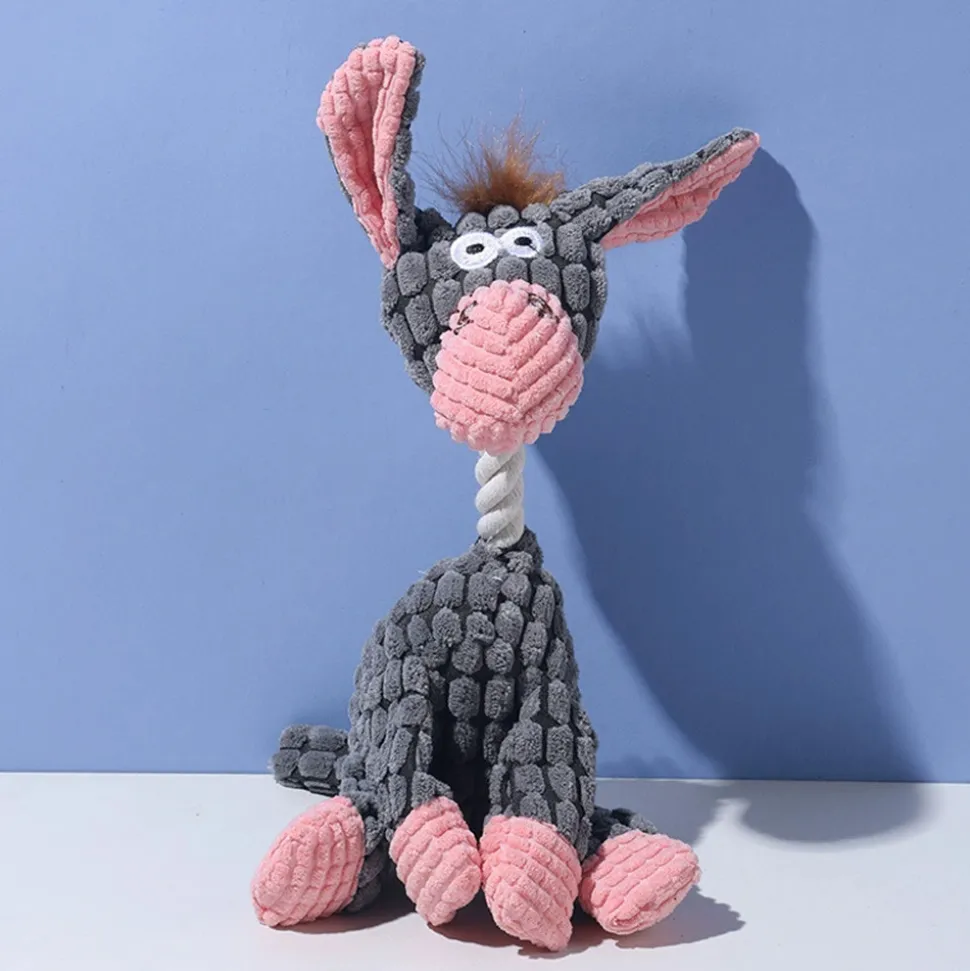 Découvrez ce charmant jouet pour chien de DtopbuyAge. S’offrant sous la forme d’un âne en peluche, il est tout à la fois mignon et fonctionnel.Le peluche est en velours côtelé, offrant une texture douce et agréable au toucher pour votre chien. Cette douceur ne l’empêche pas d’être assez résistant pour supporter les morsures et les jeux de votre chouchou.Le jouet est équipé d’un couineur qui produit un son amusant lorsqu’il est pressé. Cela attire l’attention de votre chien et l’incite à jouer, créant des moments de plaisir et d’exercice physique.Mais ce n’est pas tout. La corde intégrée dans le jouet est idéale pour le nettoyage des dents de votre chien. En mâchant la corde, il aide à éliminer les tartres et les bactéries, contribuant ainsi à une bonne hygiène orale.Avec son design gris et rose attrayant, ce jouet plaira à tous les chiens, quelle que soit leur race. Que votre chien soit grand ou petit, il trouvera en ce jouet un compagnon de jeu parfait pour des heures de divertissement et d’entraînement amusant.