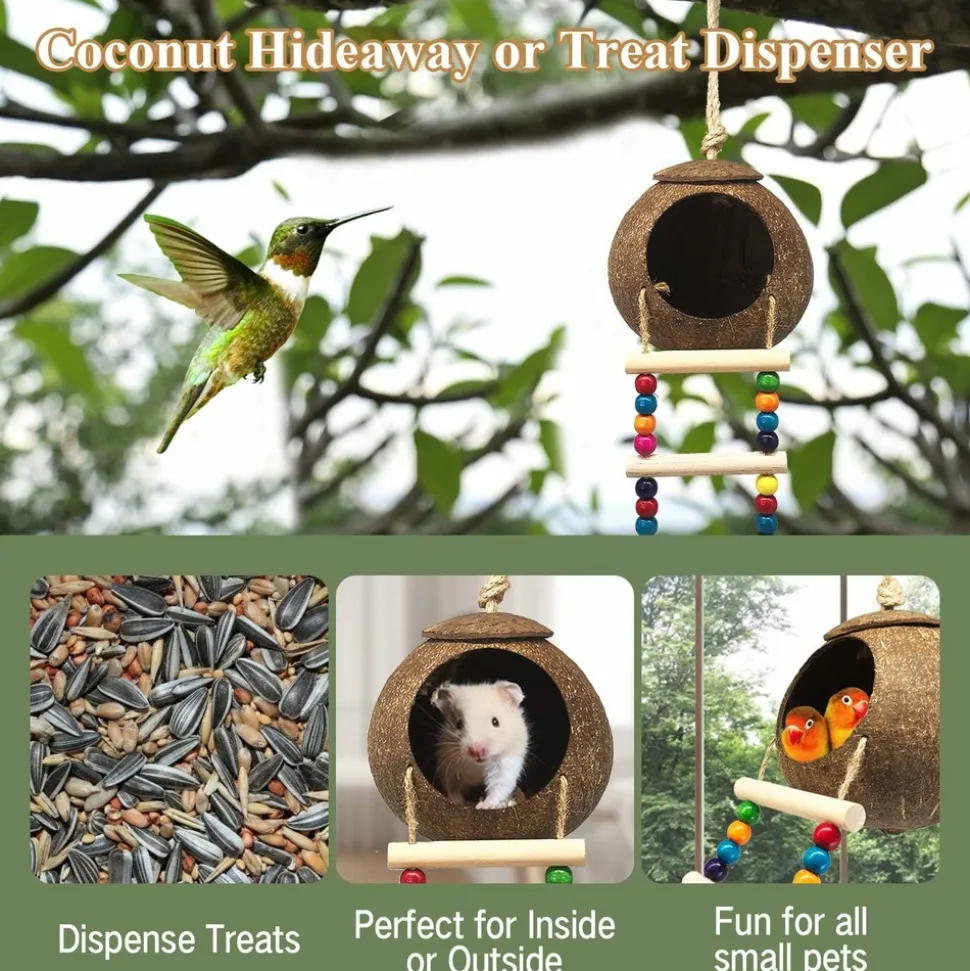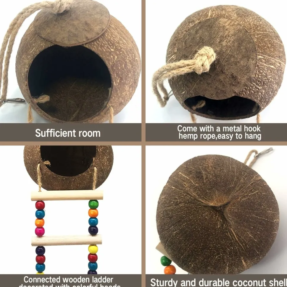 ???? MAISON D’OISEAU EN FIBRE DE COQUES DE NOIX DE COCO NATURELLES ????La maison d’oiseau est fabriquée à partir d’un des matériaux les plus résistants naturels, la coque de noix de coco, garantissant sa durabilité et sa sécurité. Elle se connecte facilement à la cage grâce à un crochet métallique. Les charmants perles colorées attireront les oiseaux de loin. ????⚡️ DIMENSIONS DE LA CAGE D’OISEAU ⚡️Le nid en fibre de noix de coco a un diamètre d’ouverture de 7,6 cm, un diamètre de coquille de noix de coco d’environ 13 cm et une longueur d’échelle d’environ 27,5 cm, largeur de 9,9 cm. Étant fait à la main, une erreur de mesure de 1 – 2 cm est admise. ???????? PARFAIT POUR UN NID D’OISEAU ????Stérilisé, ce nid en coque de noix de coco est parfait pour votre animal de compagnie. Il convient aux perroquets, perruches, pinsons, canaris, oiseaux chanteurs, colibris, perruches et autres petits oiseaux. De plus, les hamsters, rats, crabes errants et furets adorent ce produit. ???????????? HABITAT PARFAIT ????La boîte de nidification peut stocker de la nourriture et des graines. C’est le refuge préféré des perruches. Contrairement aux autres maisons d’oiseaux, la maison d’oiseau en coque de noix de coco ne moisira jamais. Sa composition naturelle et non traitée la rend très attrayante pour vos animaux. Quand il fait froid, vous pouvez mettre de l’herbe dans le nid, les oiseaux seront très au chaud. ???????? PLATEFORME D’ACTIVITÉ ????Le jouet pour oiseau en noix de coco est composé d’une échelle en corde de bois rugueuse, offrant un paysage riche et texturé qui encourage l’exercice des pattes et du bec de votre oiseau. Cela aide également à usurer les griffes qui croissent continuellement pour maintenir la santé de votre oiseau. ????